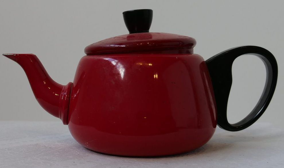 Red metal teapot with lid and plastic handle