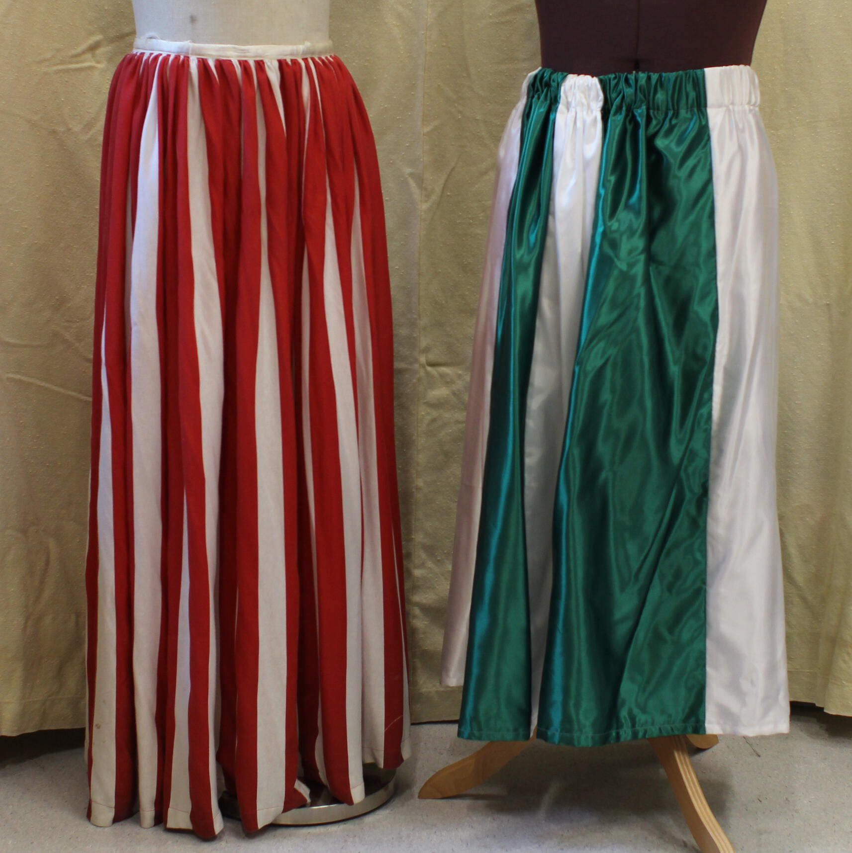 1x red and white thin stripe long skirt and 1x emerald green and white large stripe long skirt