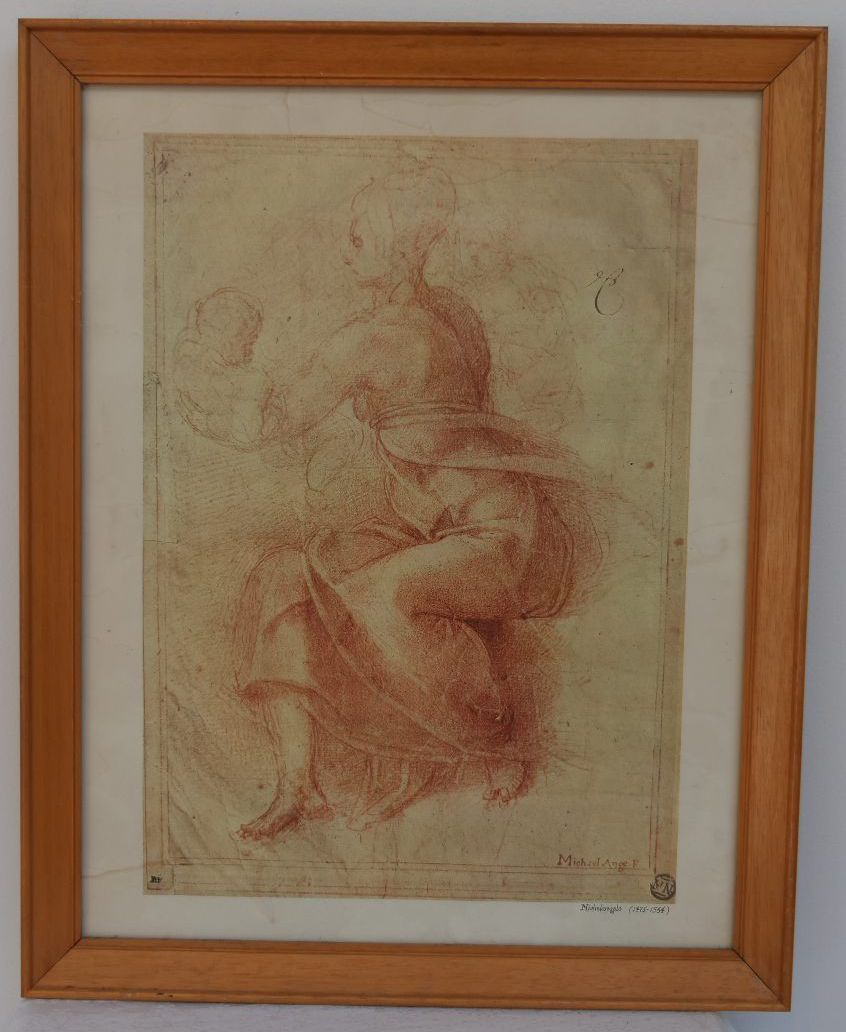 Wood frame with a print of a sketch of a woman by Michelangelo