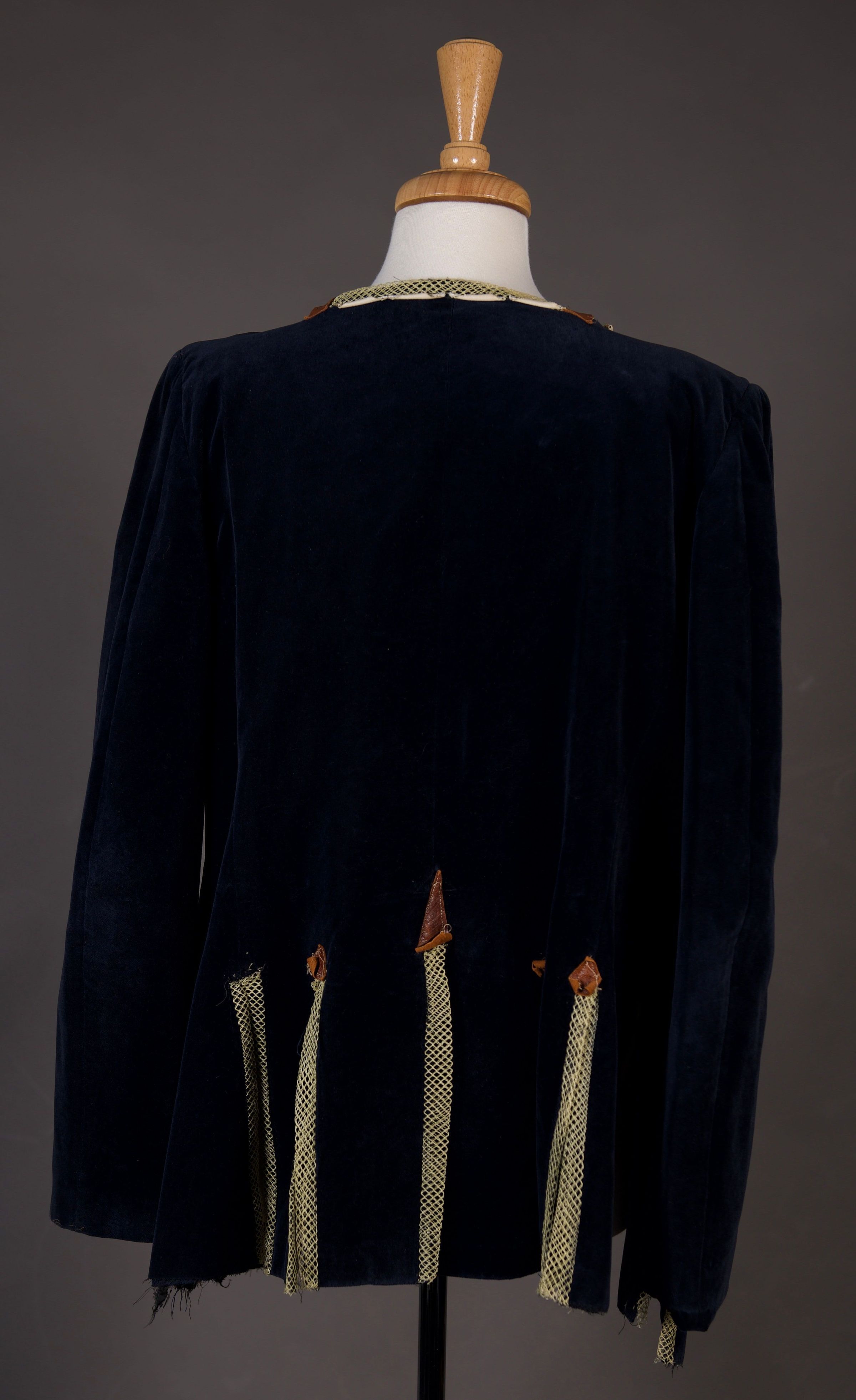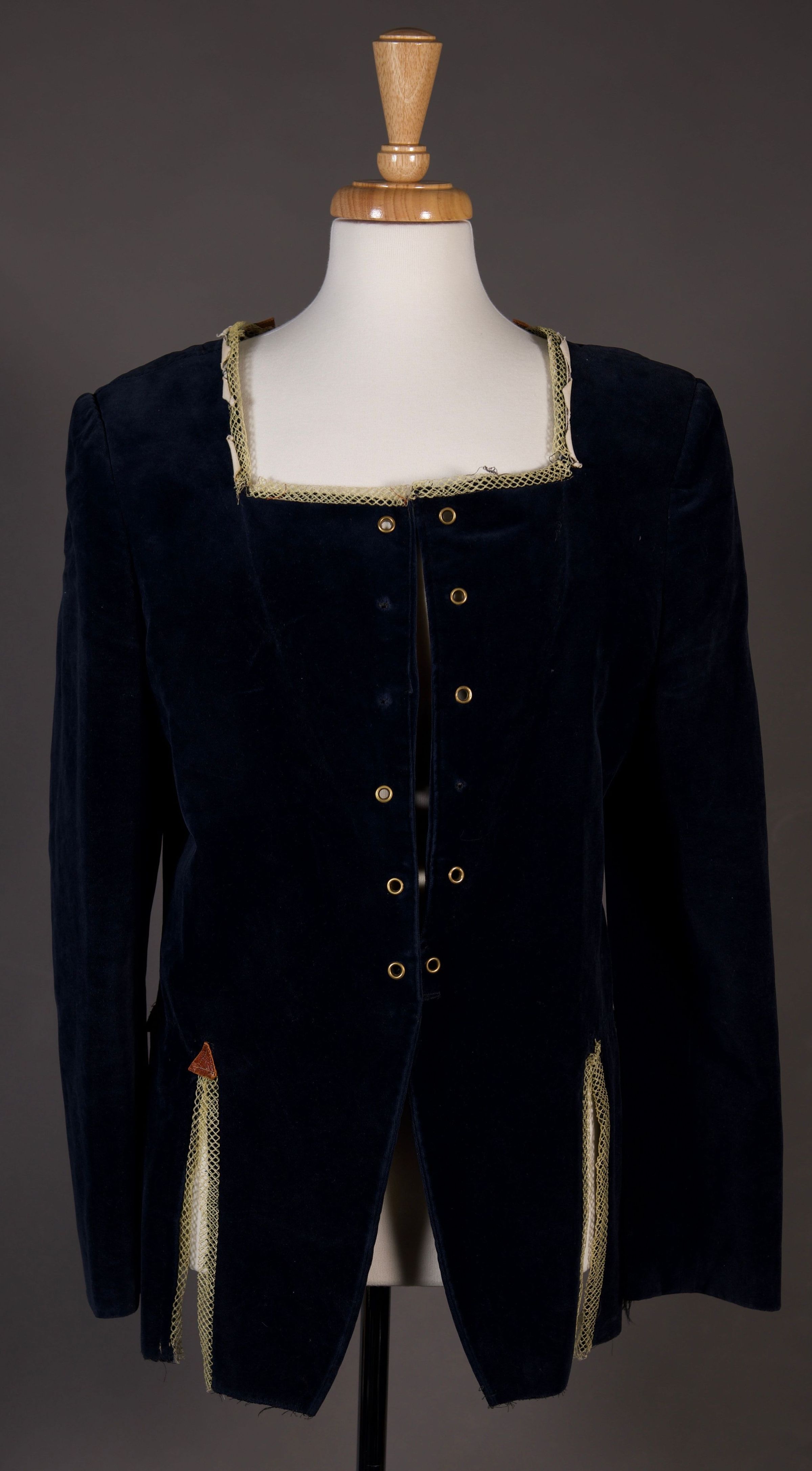 Lace up front. Navy velvet with net trim