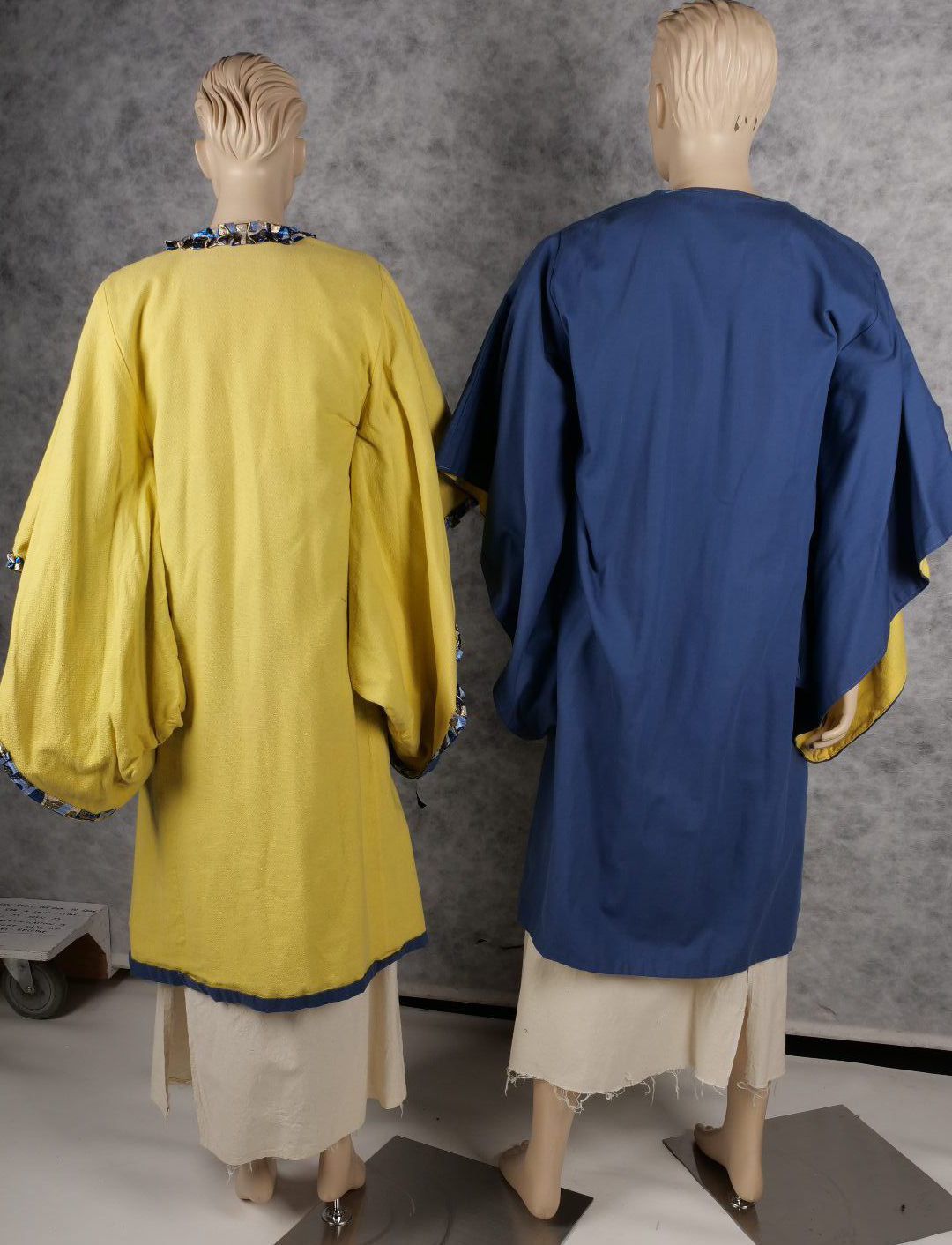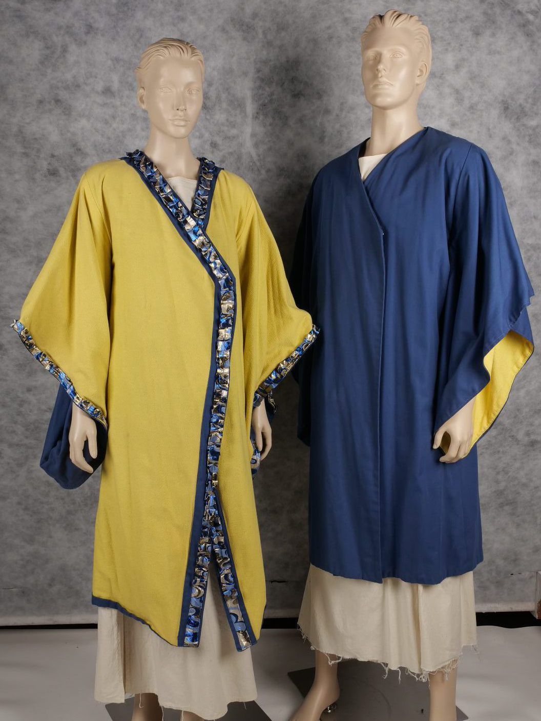 2x Kimono style coats. Yellow and blue reversible. 1 has decorative trim