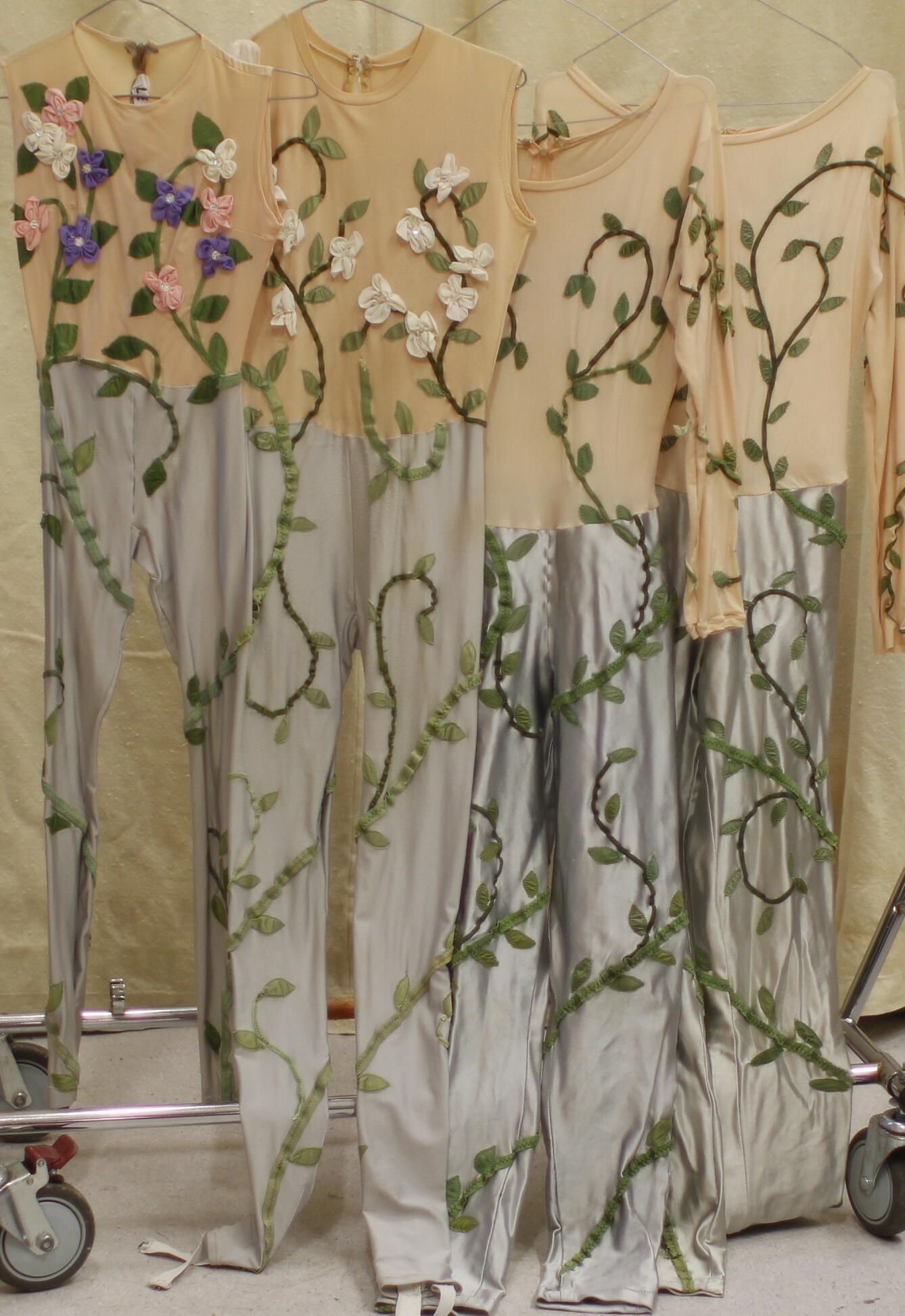 2x small sizes sleeveless leotards with flowers and vines. 2x medium (mens) sizes leotards with sleeves