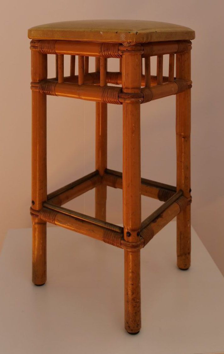 2x cane and brass stools with yellow leather seats