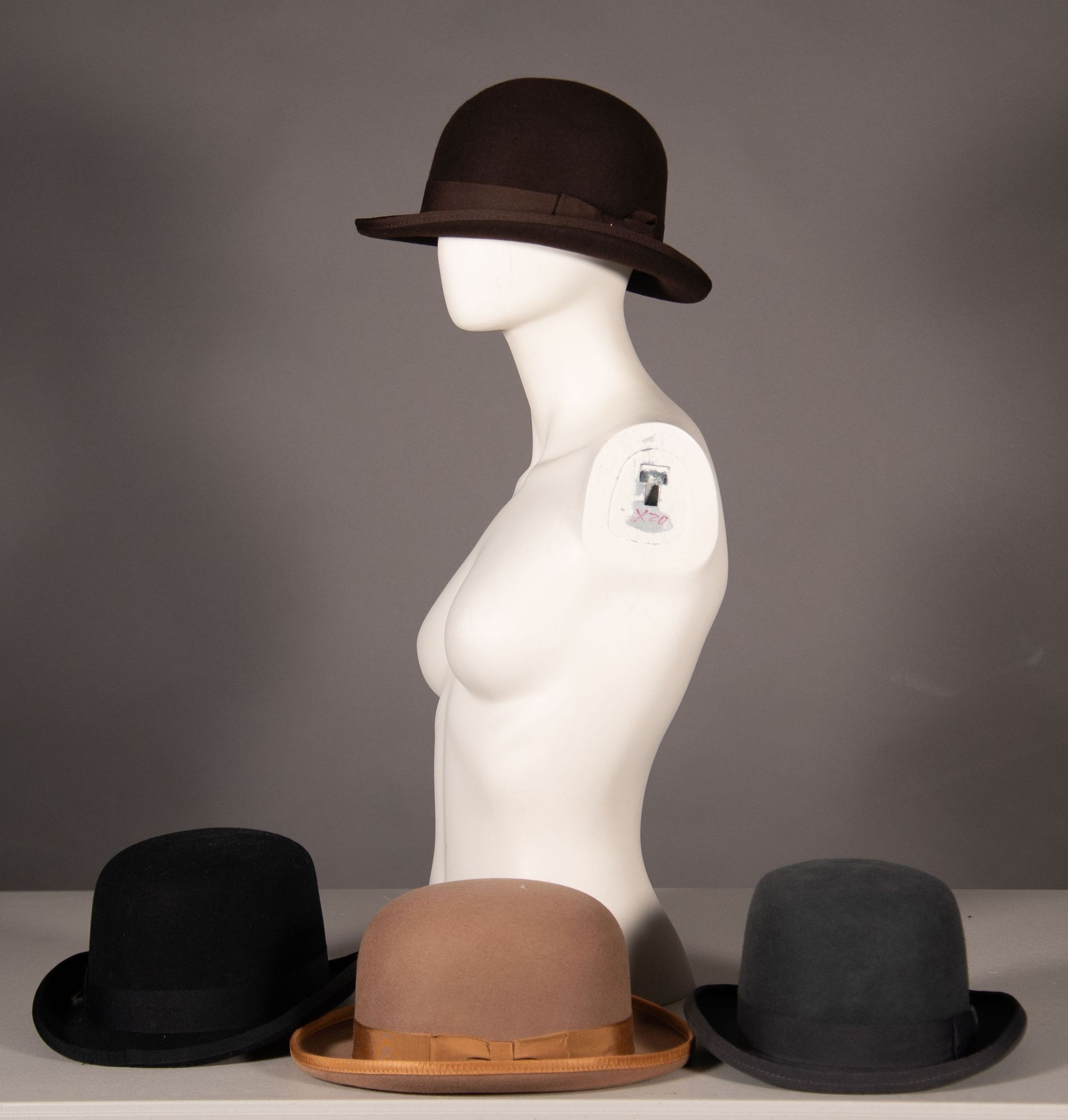 1x chocolate brown (L) 1x caramel (M) 1x metal Grey (S) 1x Black (L) wool felt bowler hats