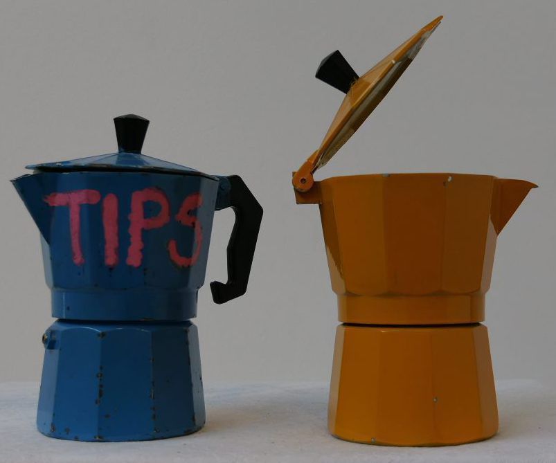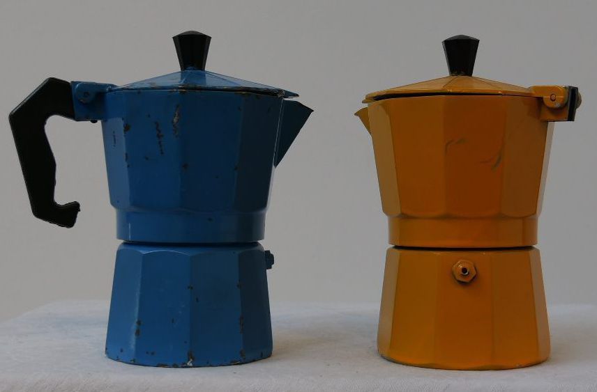 2x small coffee percolators. Yellow is mssing its handle