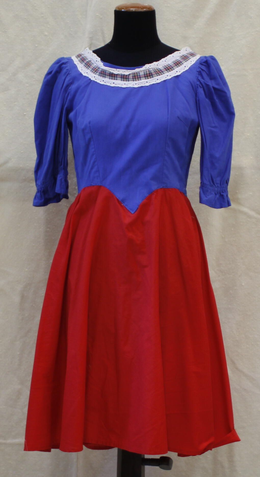 Blue bodice dress with red skirt