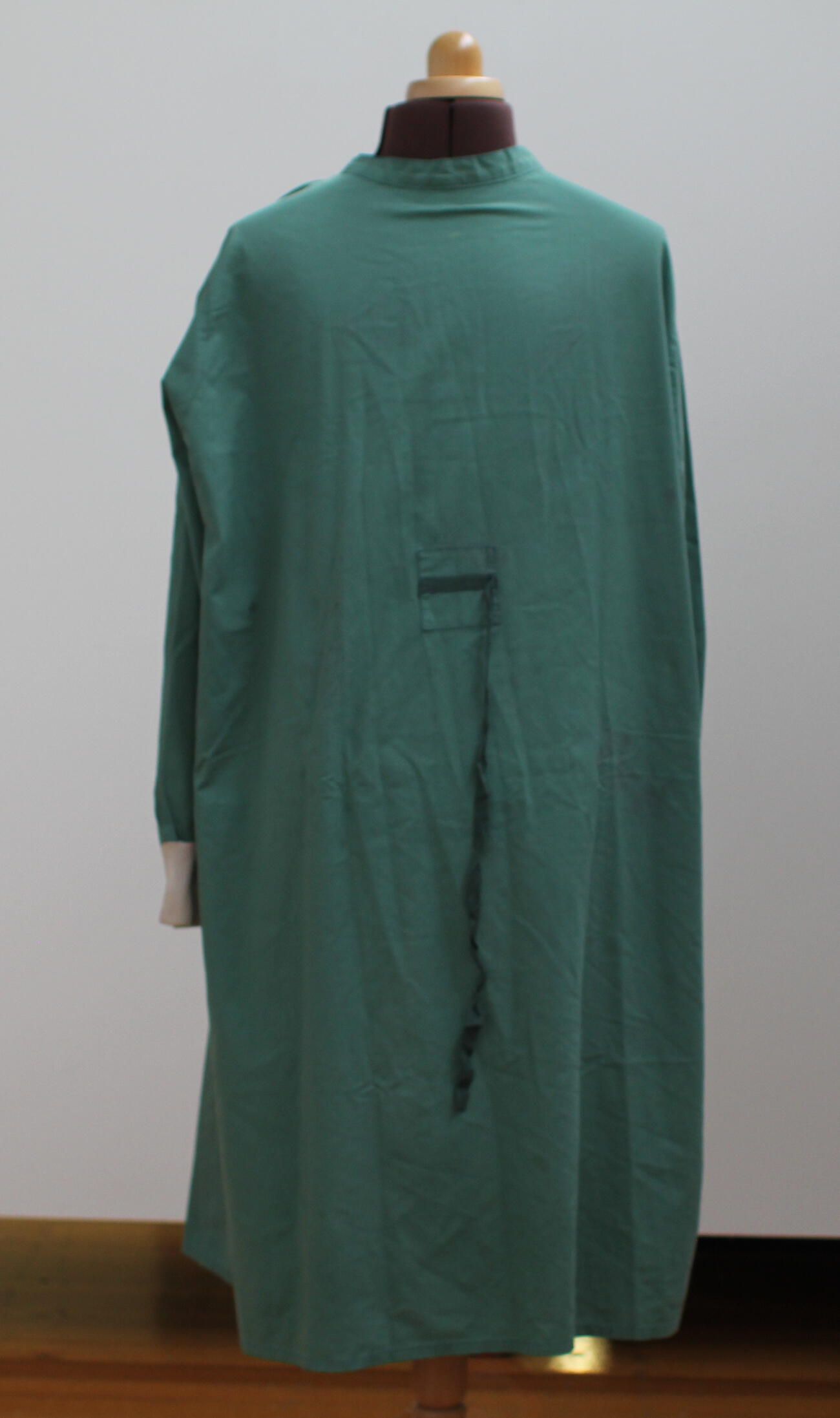 2x Green long sleeve gowns with back opening. One has rib sleeve cuffs