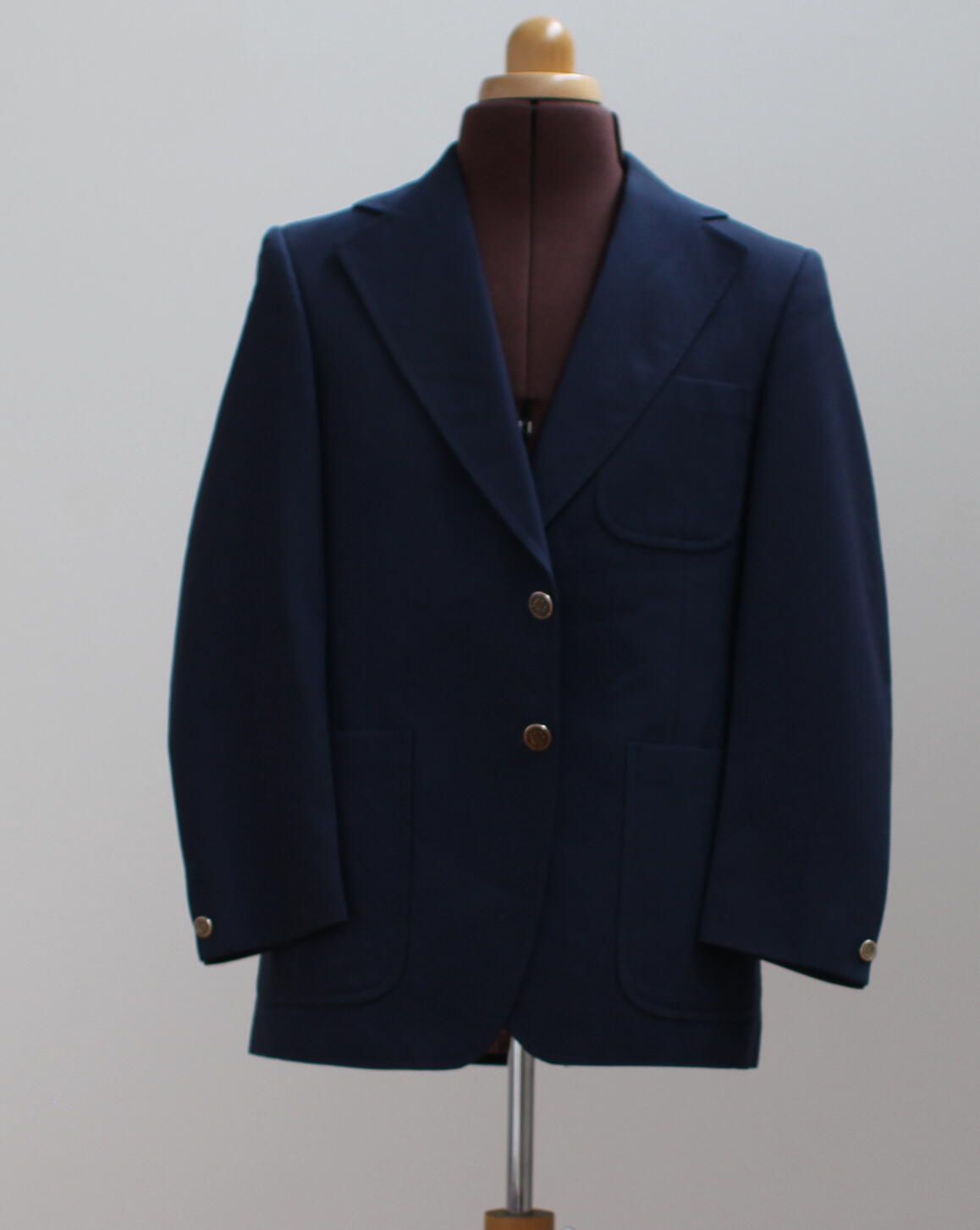 Blue Single breasted mens jacket with three patch pockets and silver metal buttons