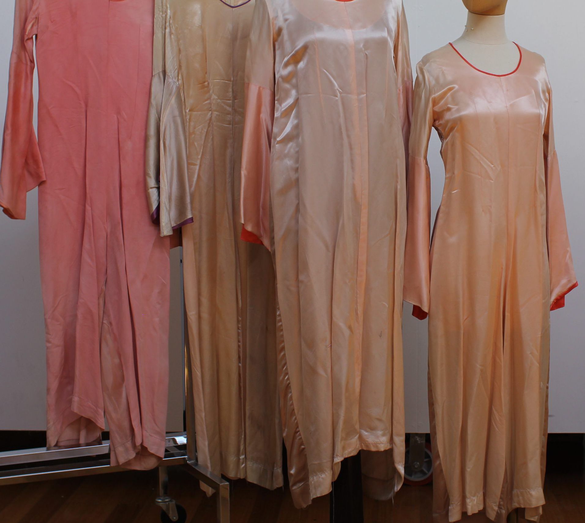 3x Satin jumpsuits with contrast binding at neck and inside sleeve hems 1x matching dress. Pieces are in broken down/aged condition with stains and fading