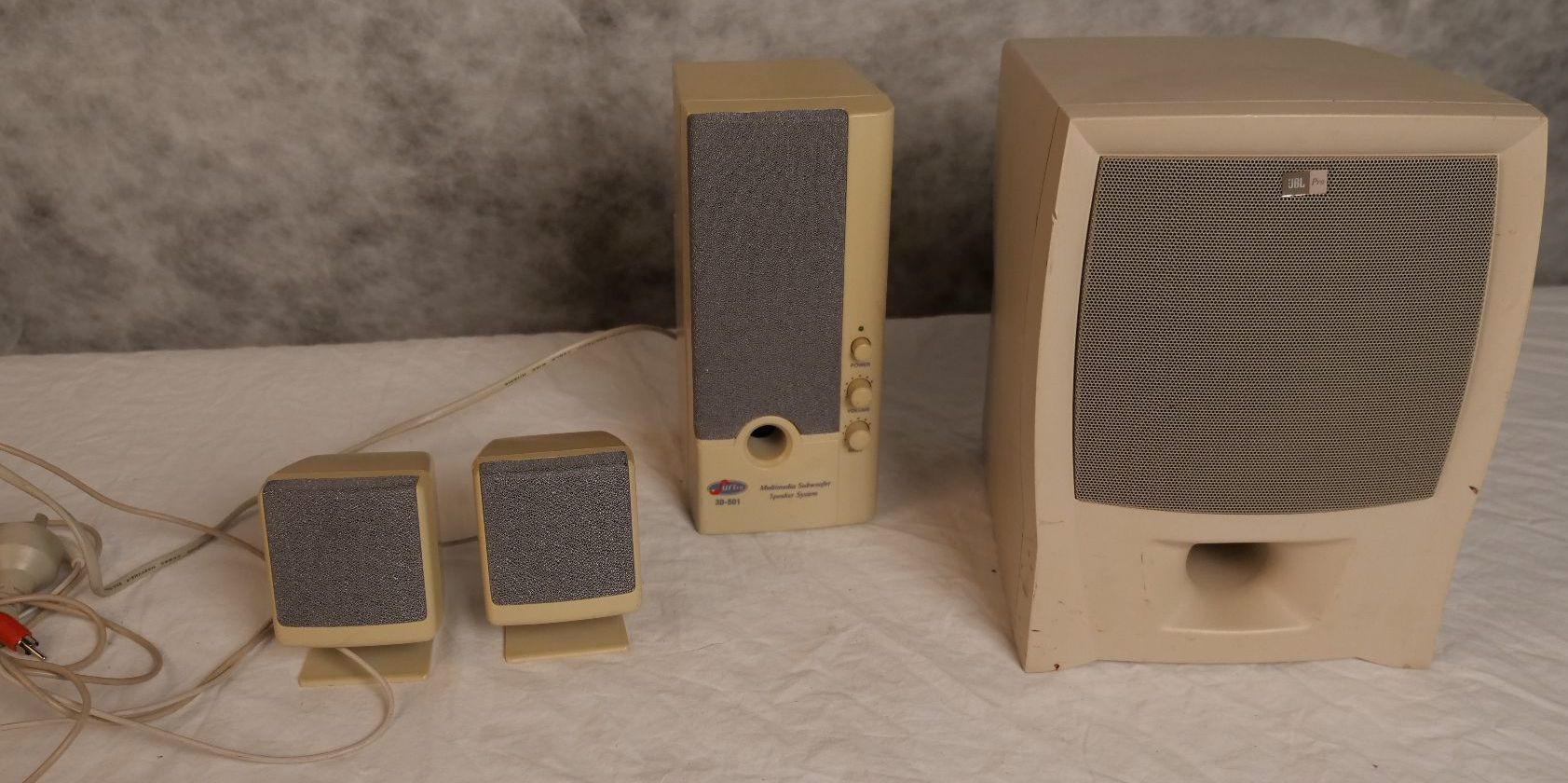 Set of 5 speakers. 2x small 7cm x 8cm x 10cm high; Medium 10cm x 13cm x 23cm high; Large 20cm x 25 cm x 27cm high
