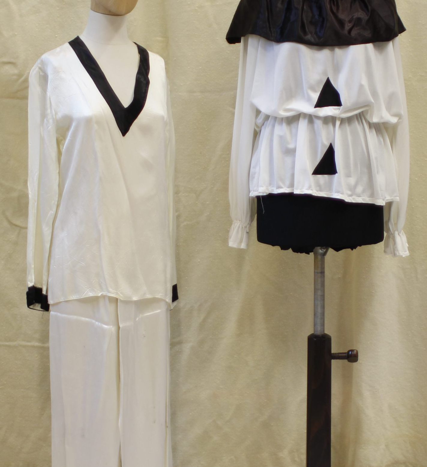 Pierrot clown inspired outfit and tops with black satin collar: White satin pyjamas with black satin trim Right: 2x white stretch knit long sleeve tops 1x Black ruffle collar
