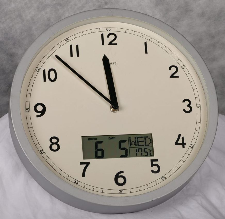 Analogue wall clock with digital screen displaying day, date and temperature