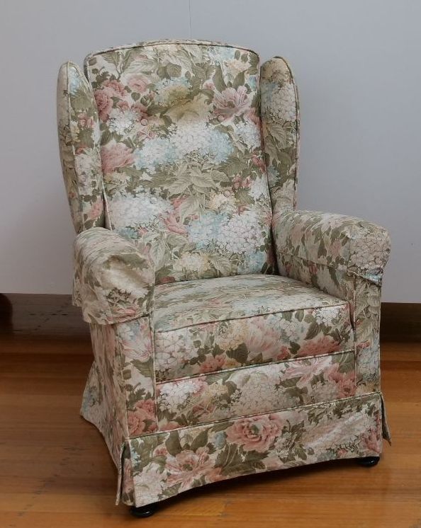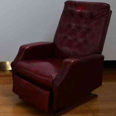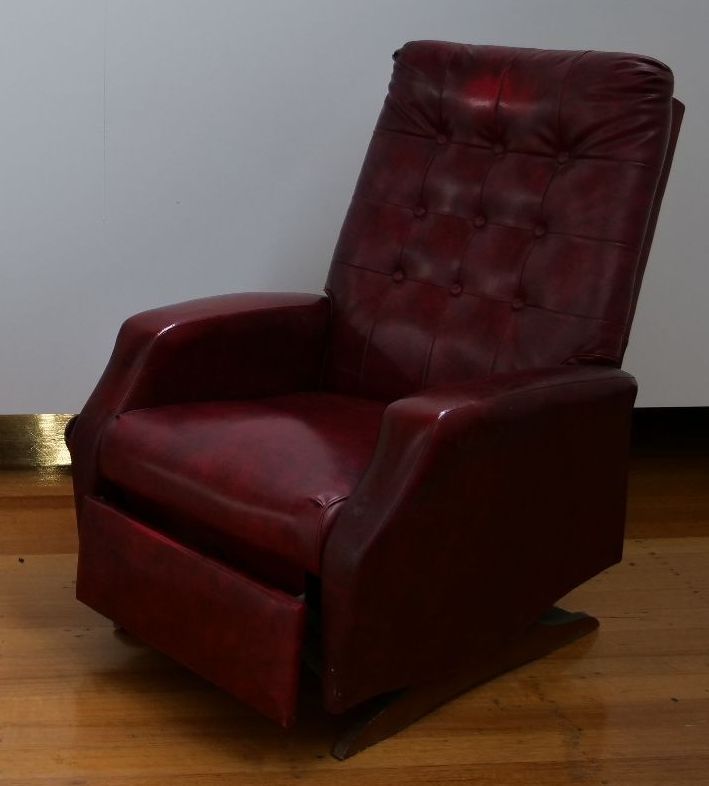 1 Floral fabric covered armchair (stationary) 1 red leather Armchair that reclines and rocks