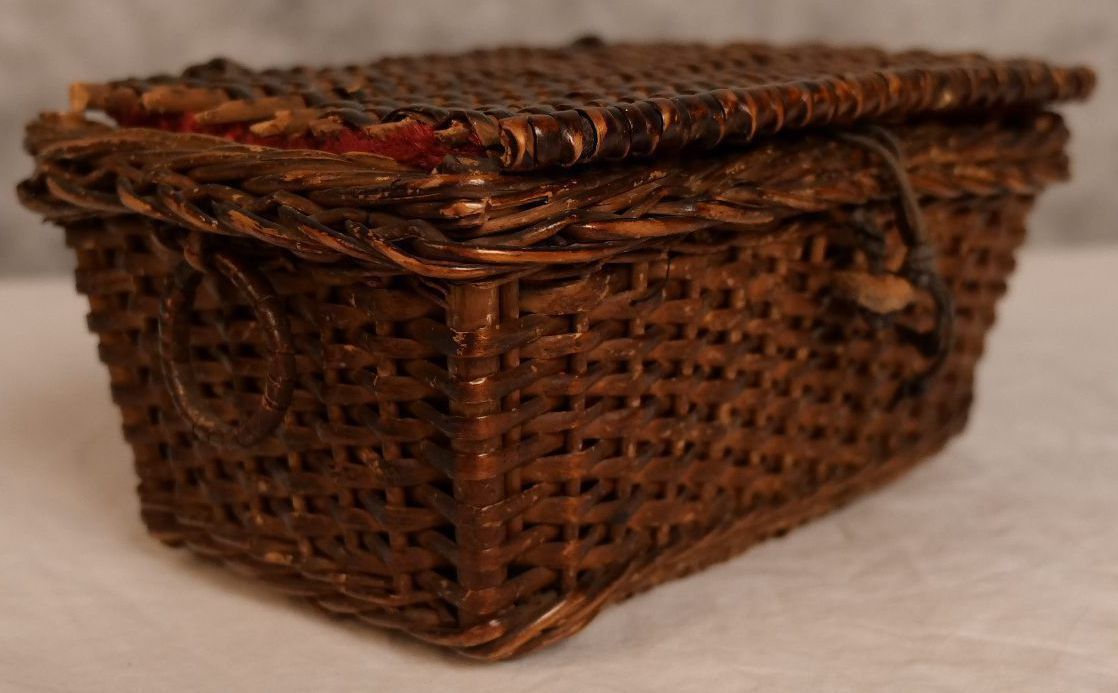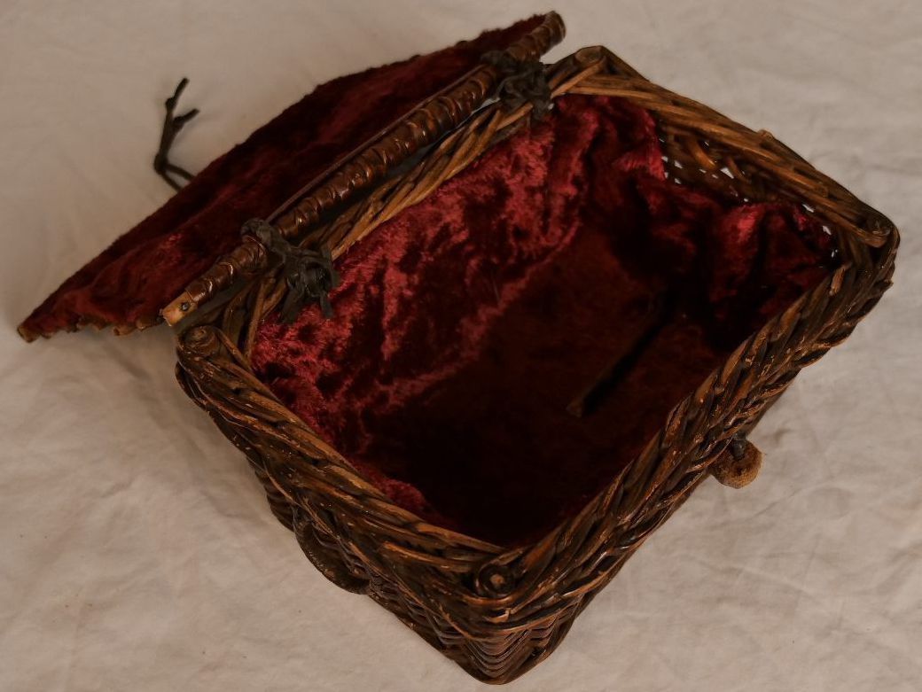 Small wicker basket with lid. Lined with red velvet