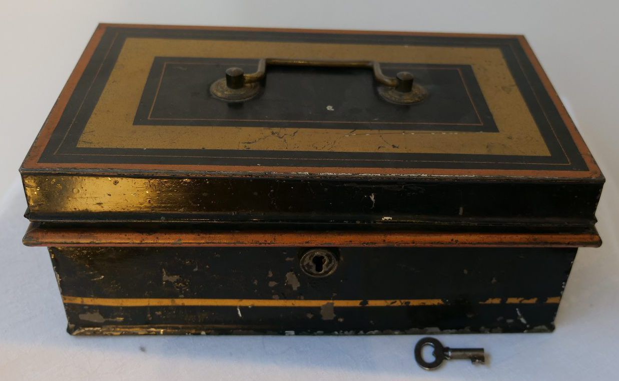 2x metal boxes with hinged lids. 1 with lock key