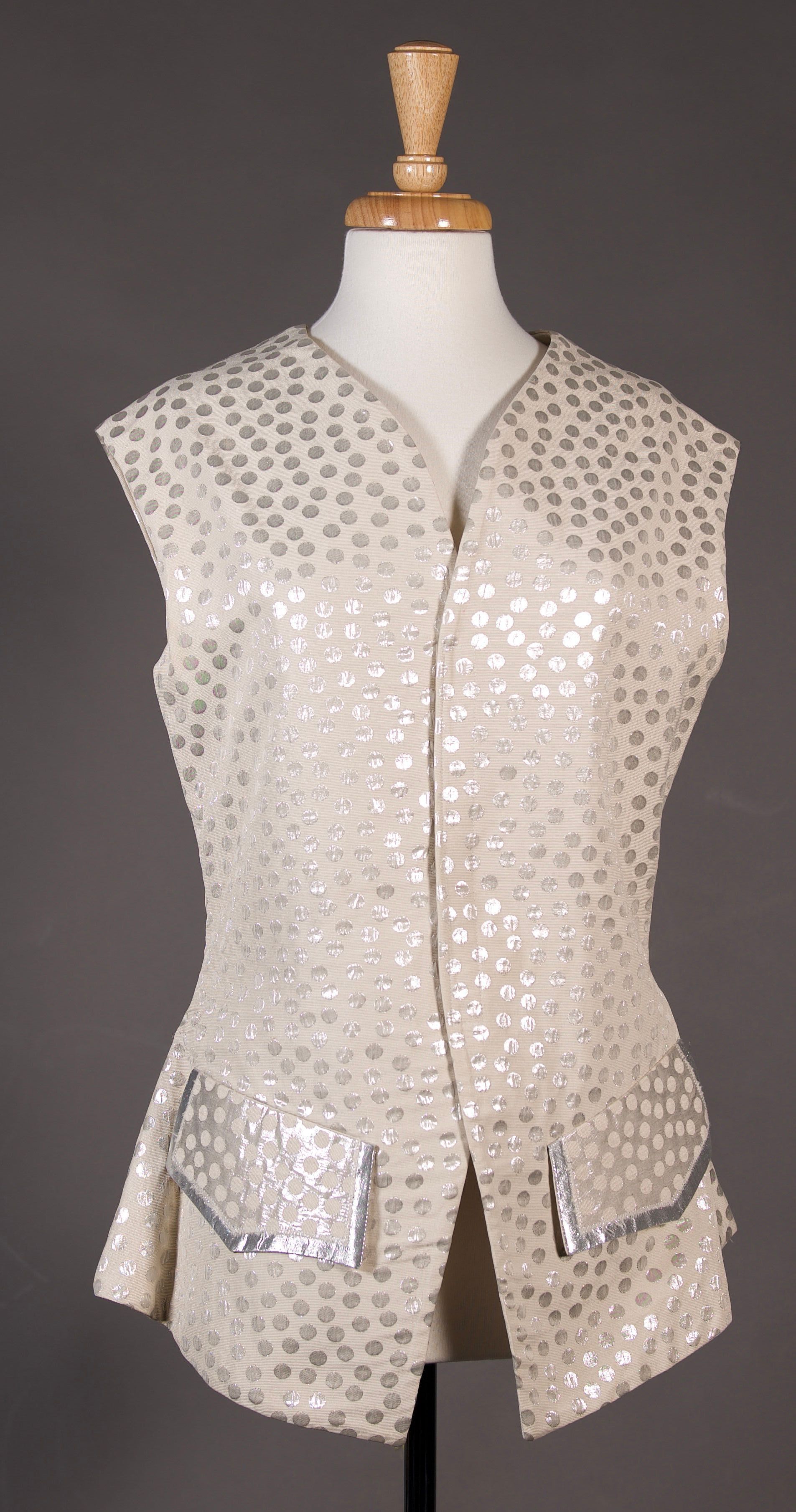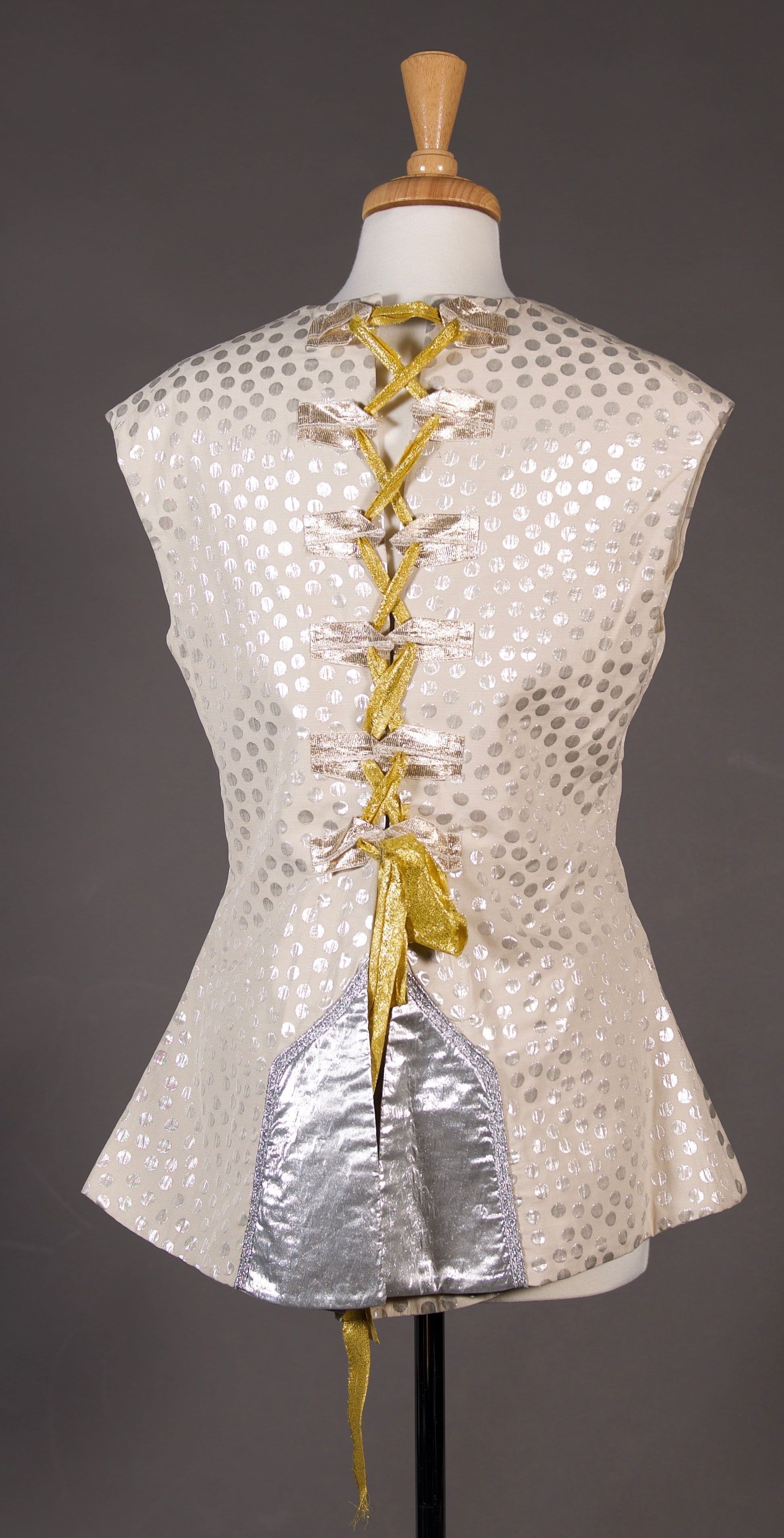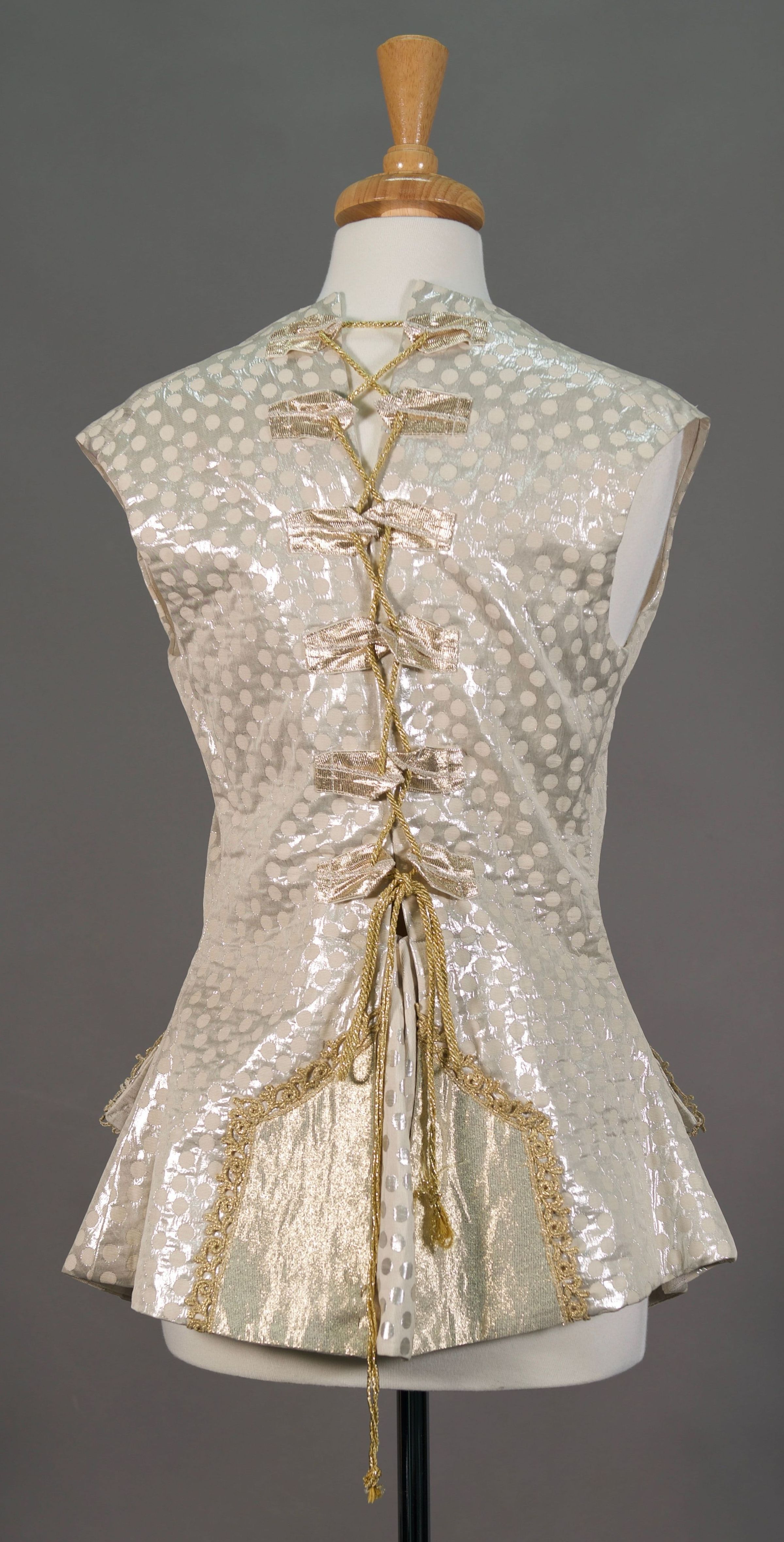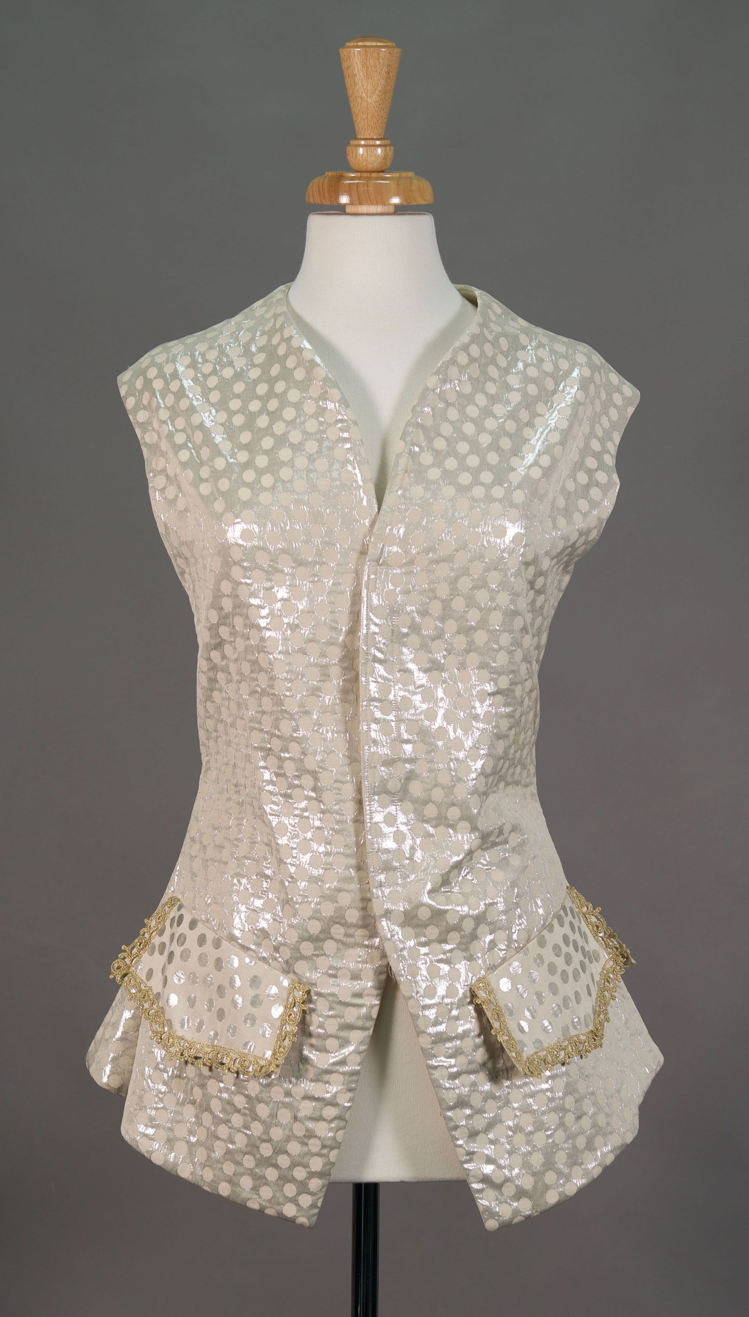 2 silver/cream polka dot waistcoats with either gold or silver trim on pockets. Both lace centre back.