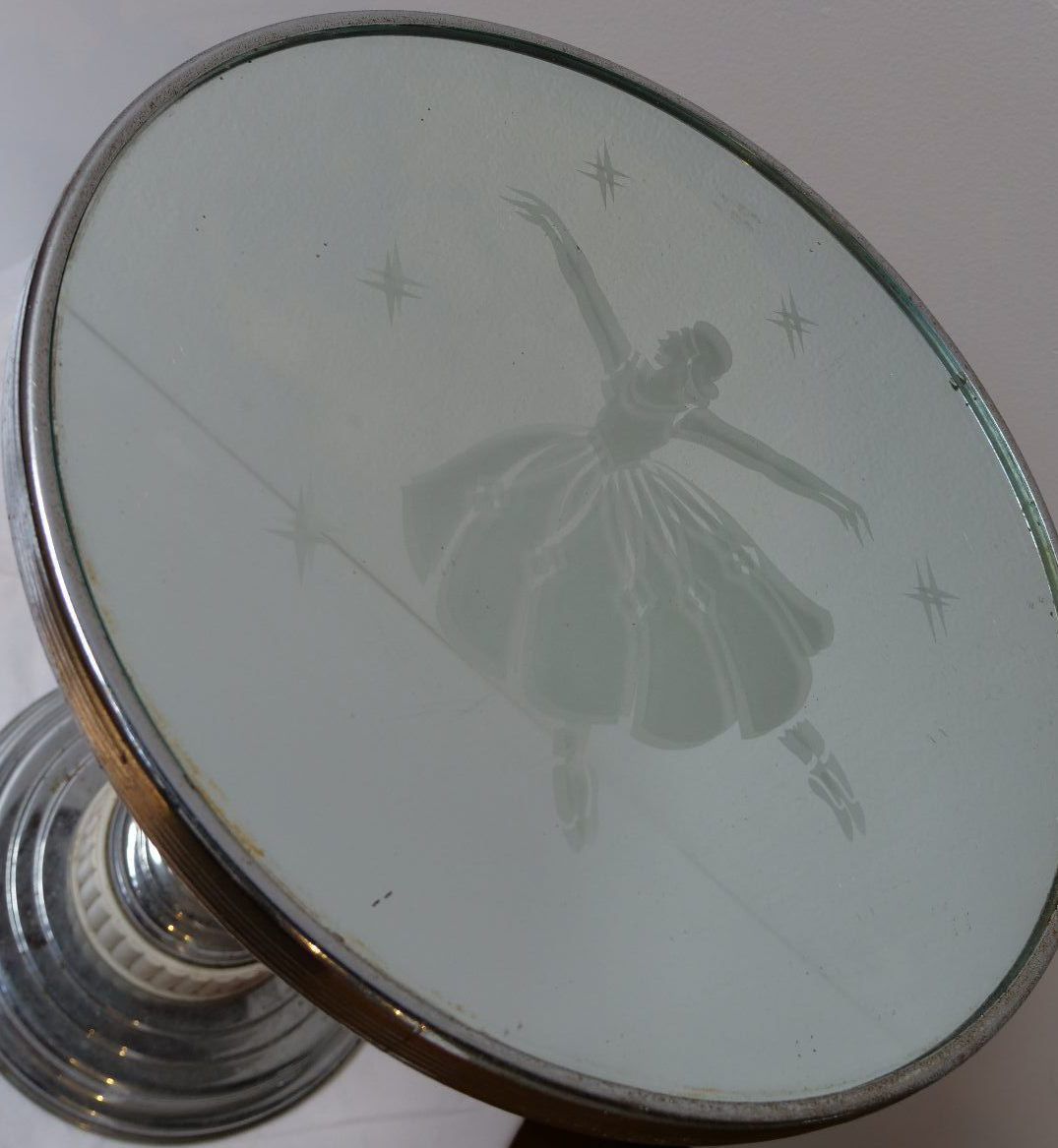 Crome and Bakelite with an etched (Ballerina) mirrored table top.