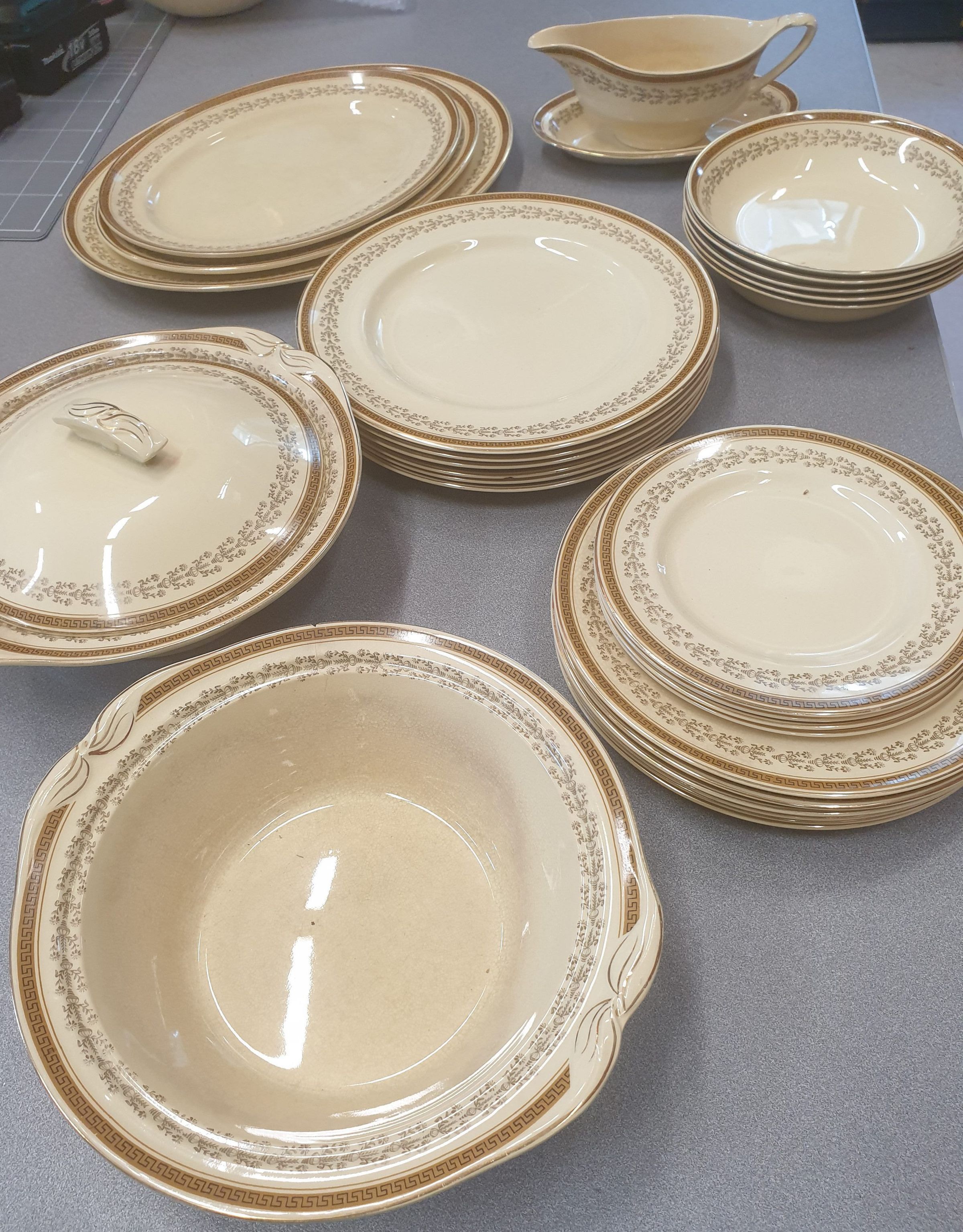Fancy diningware set. 3 different sizes of plates; 5 x bowls; 3x serving platters and 2x serving bowls (1 lid) and gravy jug with saucer