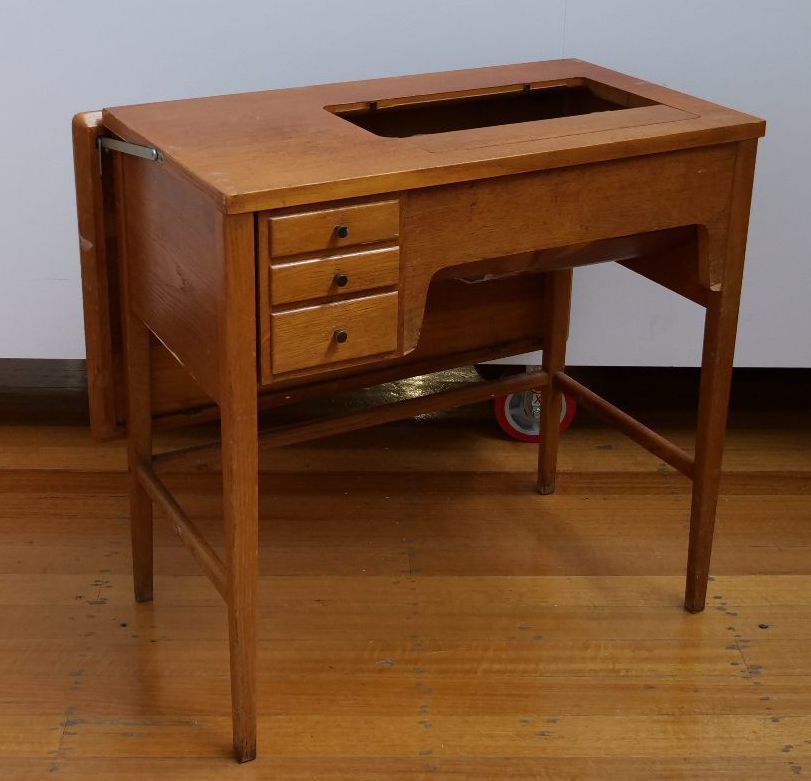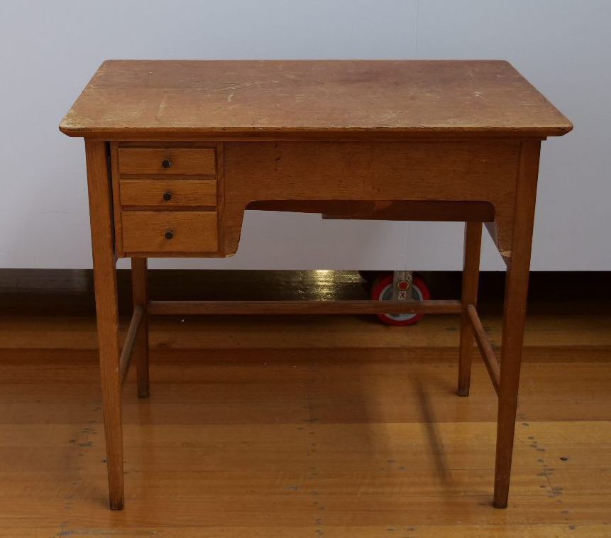 House desk or table. Once was a sewing machine table so lid or table lifts up and behind to reveal a compartment that can fit a sewing machine