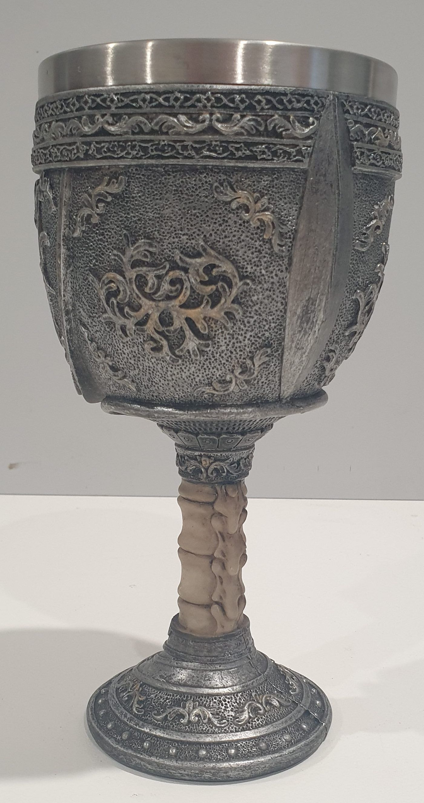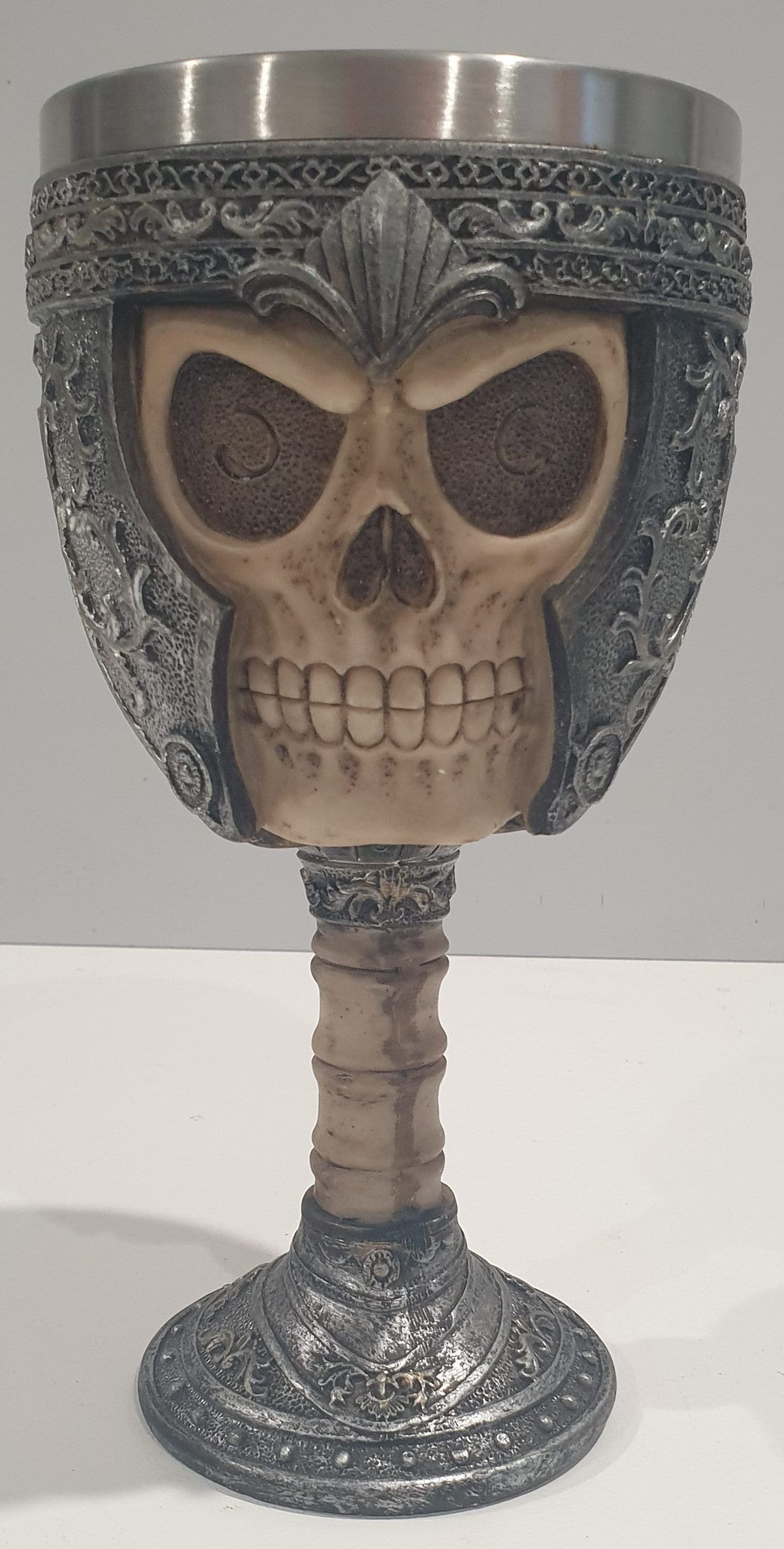 Resin cast drinking vessel with aluminium cup. Medieval skull in knights helmet