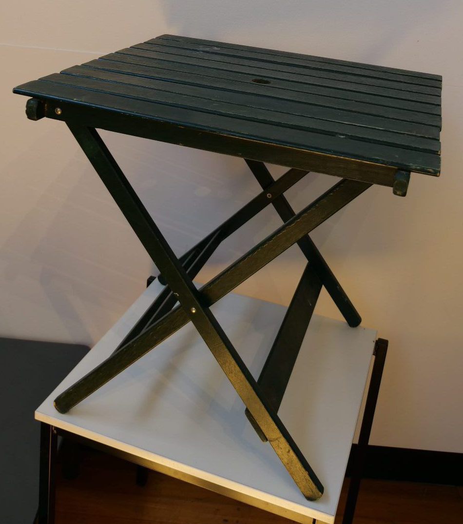 wooden and painted dark green. Has a round hole in centre of table for an umbrella