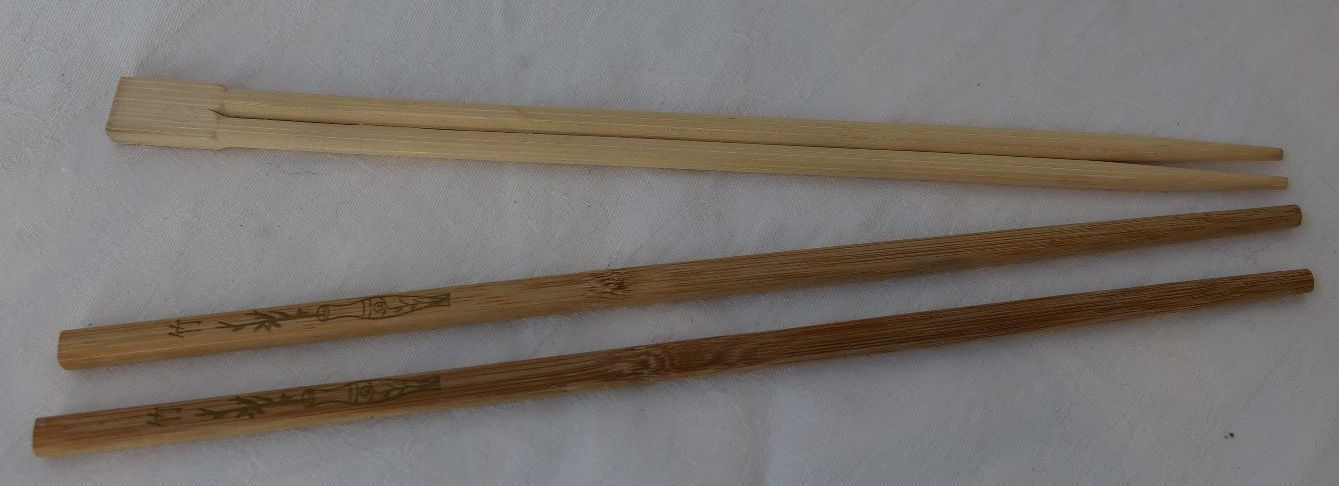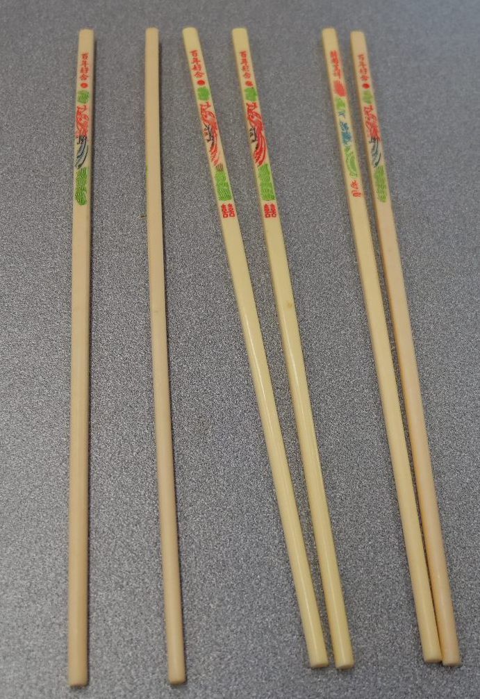 3 pairs of plastic 'restaurant' chopsticks and 2 pairs of wooden 'takeaway' chopsticks