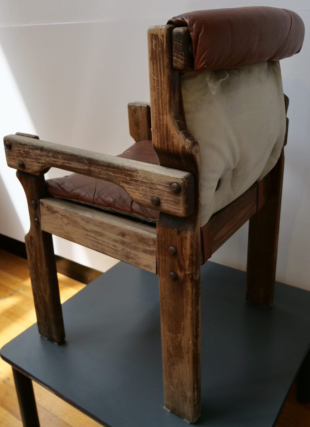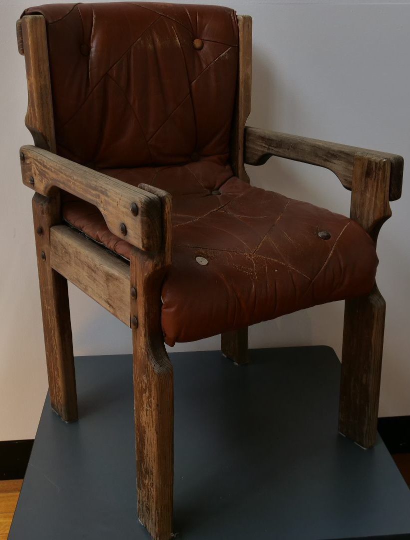 Well worn condition leather and wood arm chair