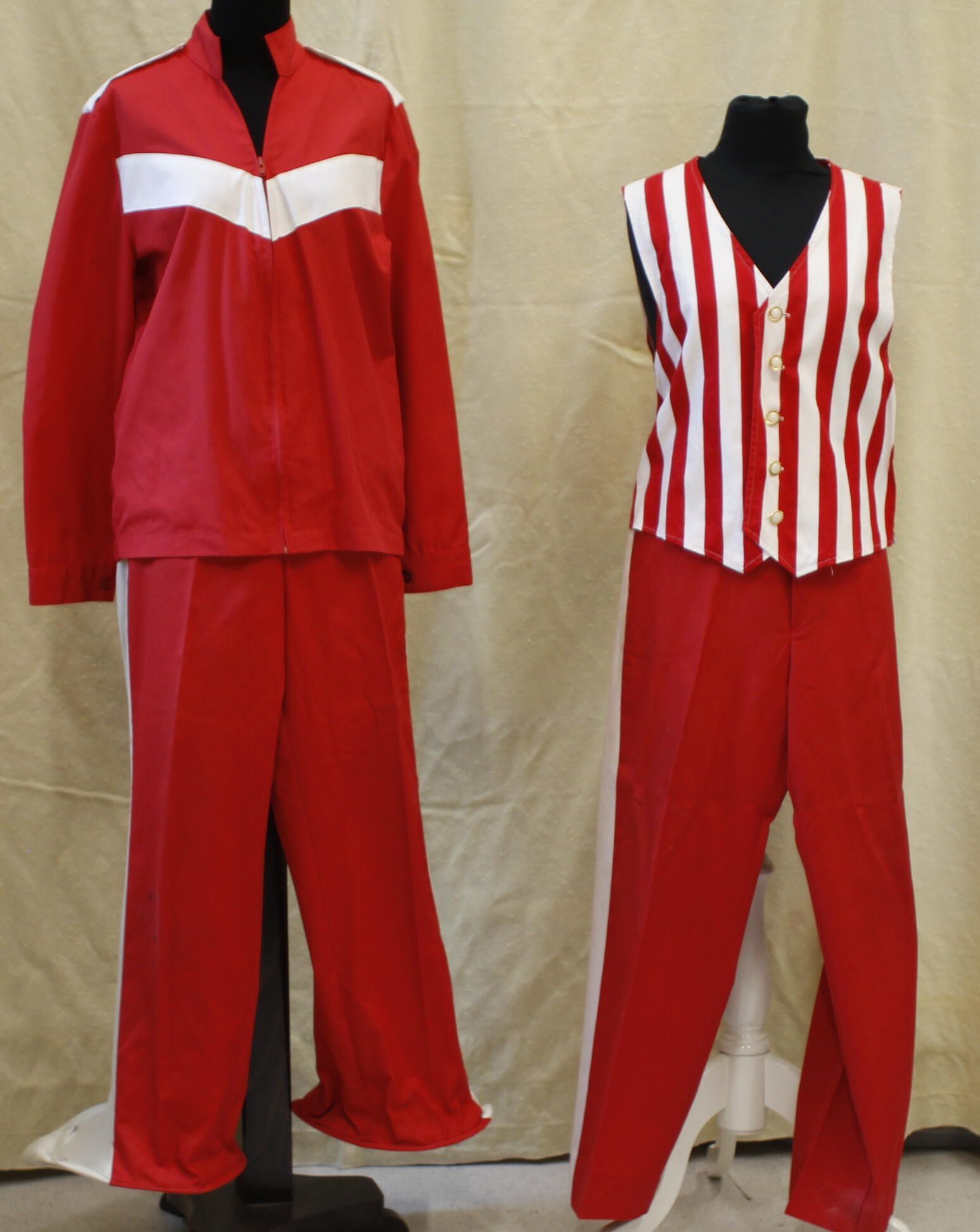 Red and white jackets, pants and striped waistcoats