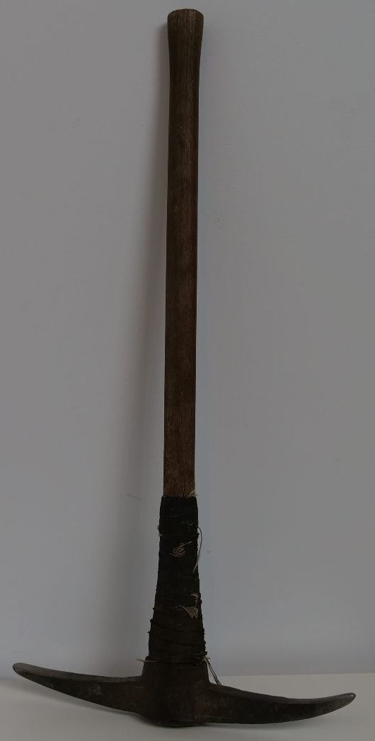 Old metal pick axe with wooden handle