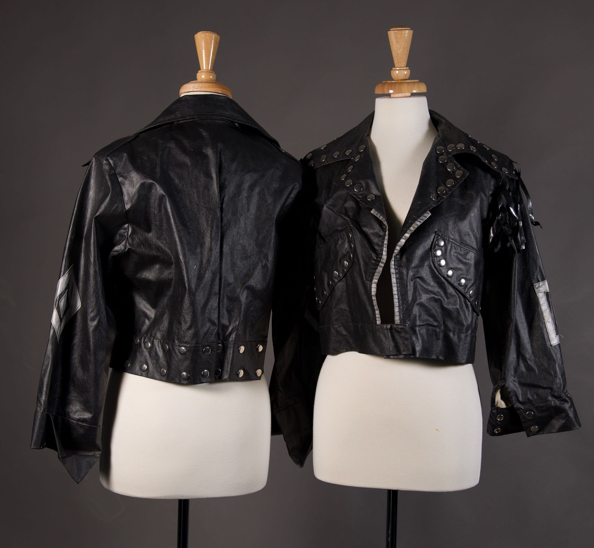 Vinyl leather look with metal studs and plastic fringe