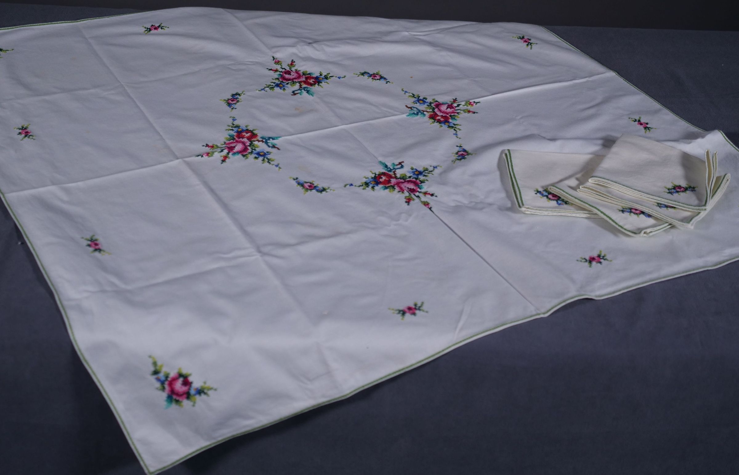 Small square cotton table cloth with cross stitch embroidery. Has 4 matching napkins