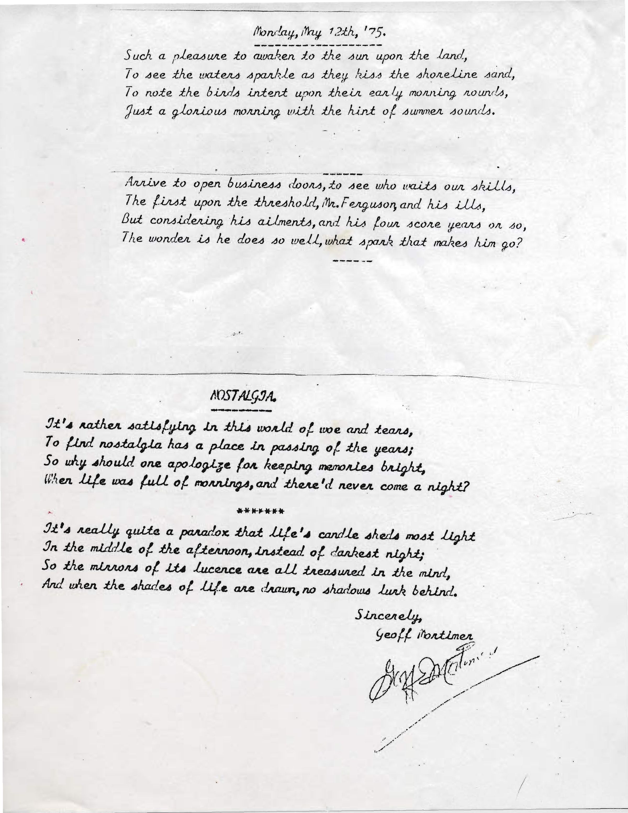 Geoff Mortimer poems. Gift to John Ferguson, father of Audrey Jenkins. Contact DCHS office for full pdf copy