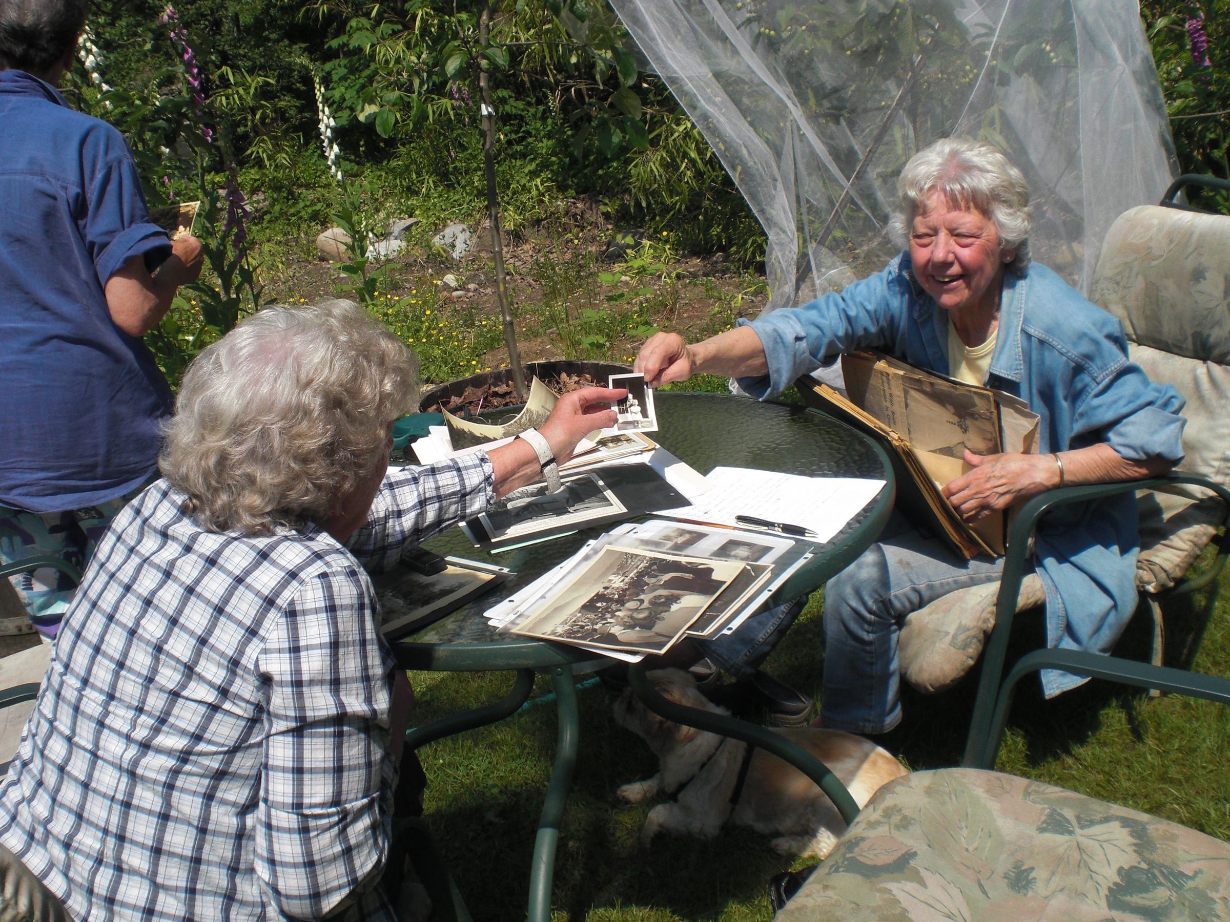Janet Pavlik and Sharron Hogan examining photos and scrapbook CIMG0182.JPG
