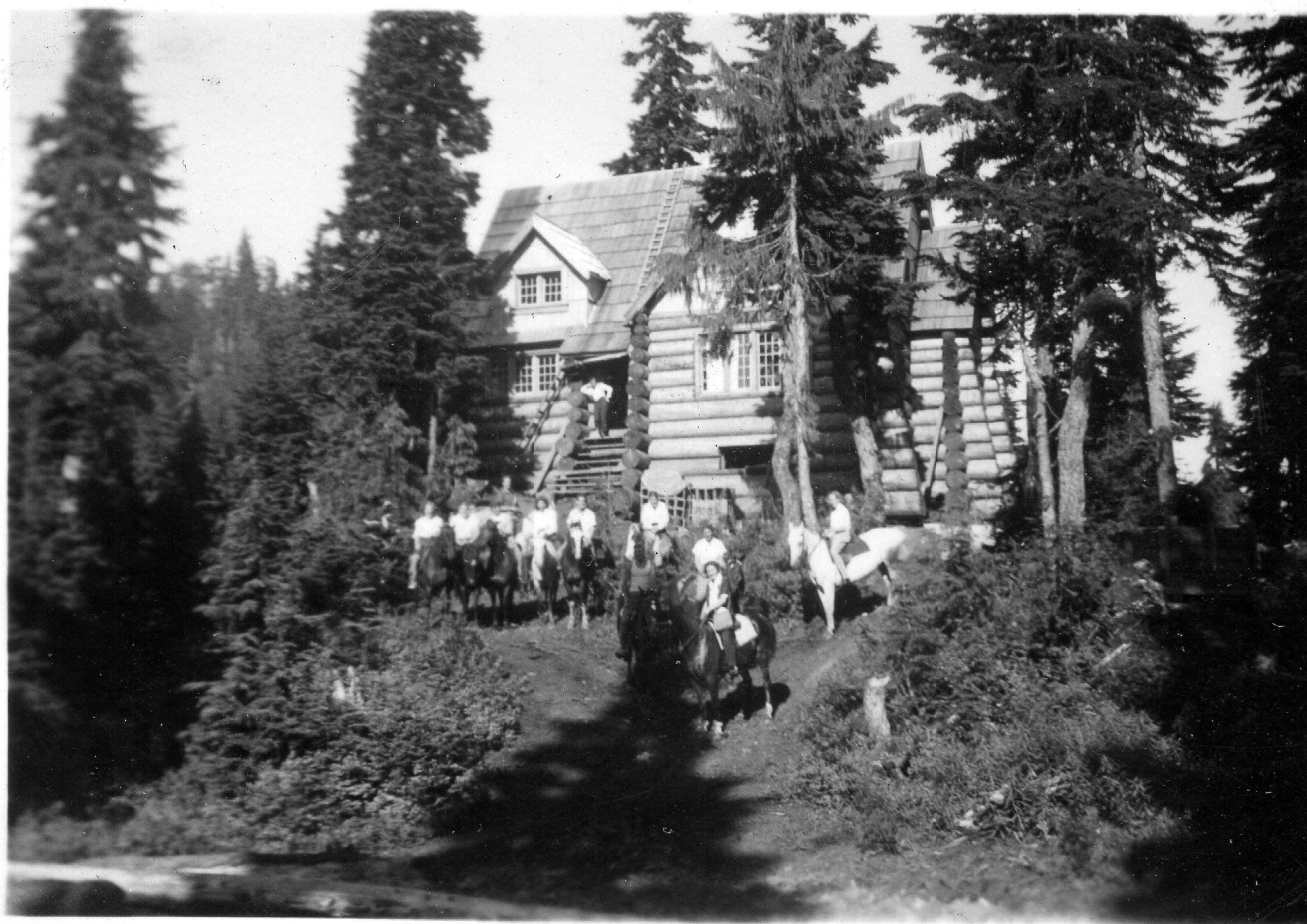 4853 - Eleven Horse riders in front of lodge on Mt Seymour 1946-08-24.tif