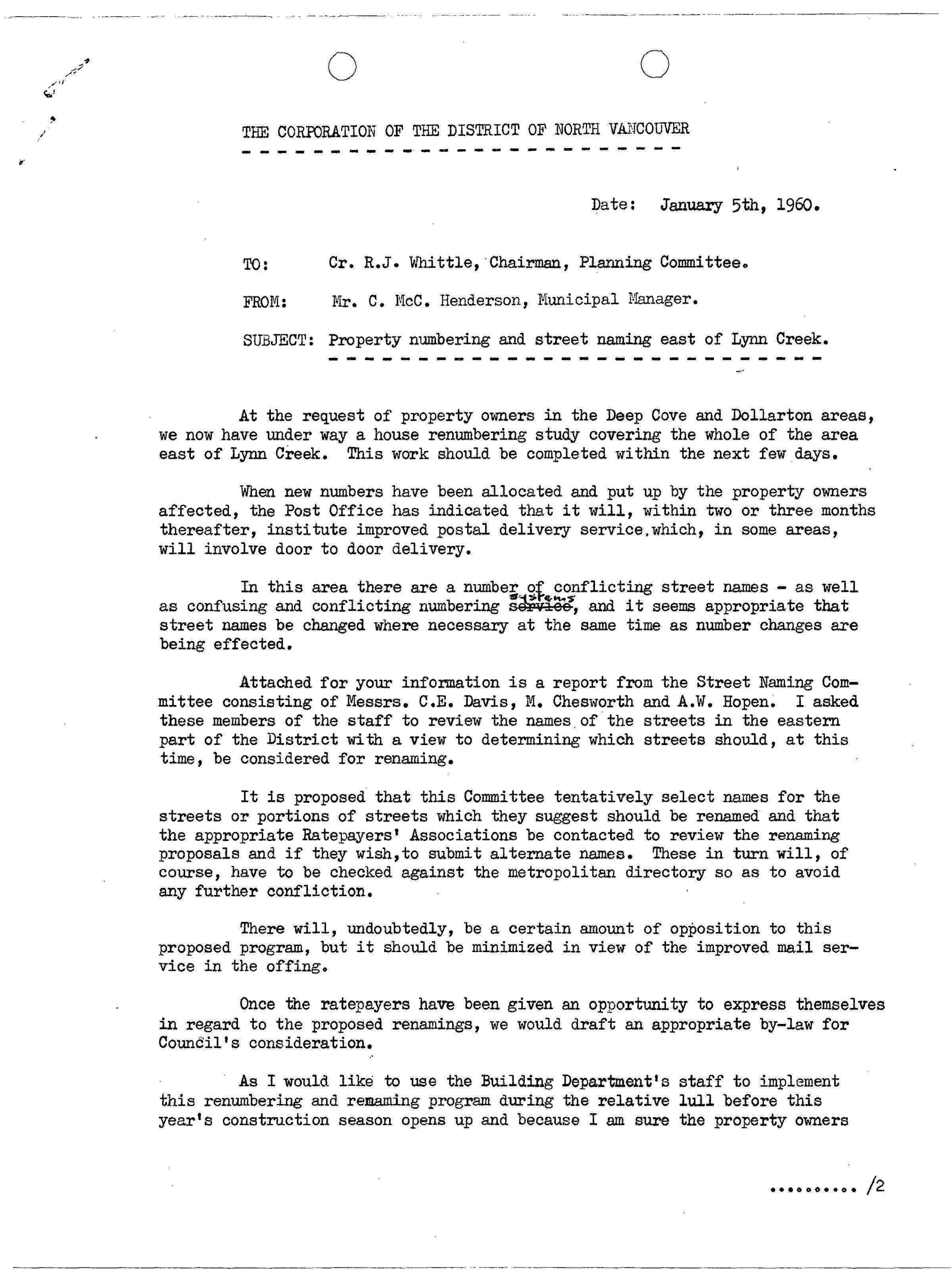 Documents from 1960 on street renaming - See Heritage files for more information, street names, and map