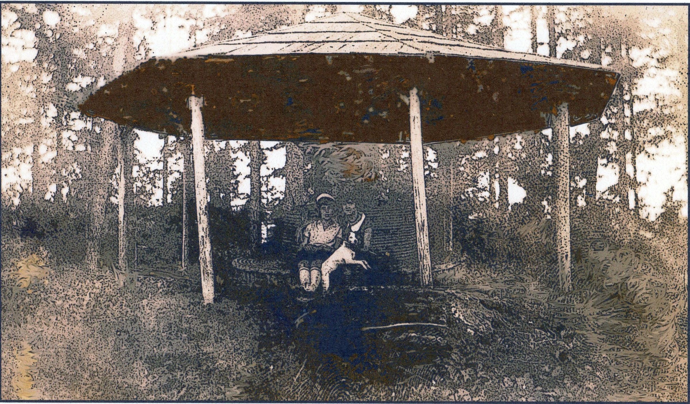 Two girls in forest gazebo