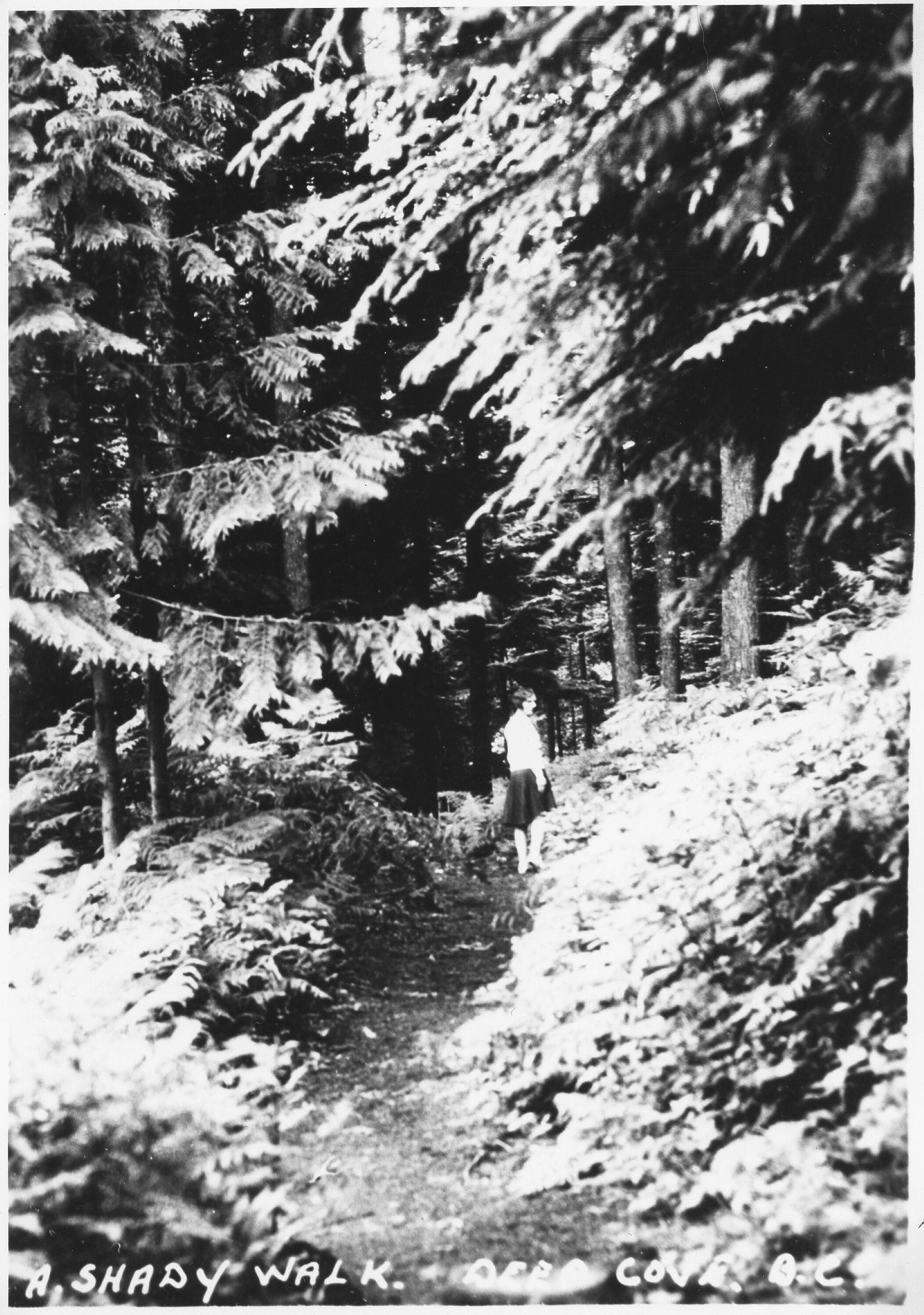 0114 "A Shady Walk. Deep Cove, BC" printed in white at bottom Vertical black and white photograph path in wooded area
