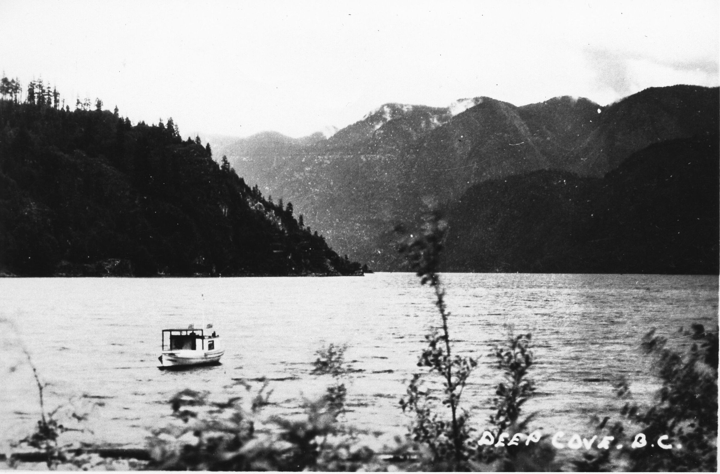 Black and white photograph of Deep Cove inlet, boat to the left, Mountains in background