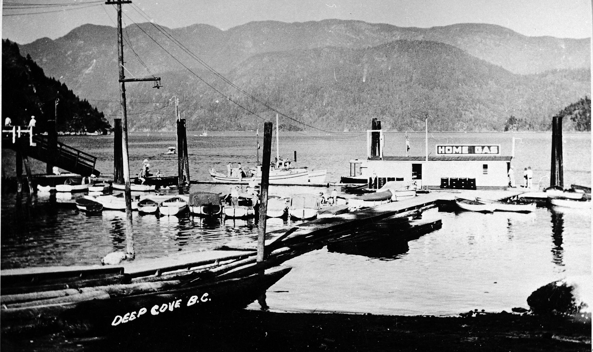 Deep Cove B.C. printed in white on print over boat in foregroundCollection