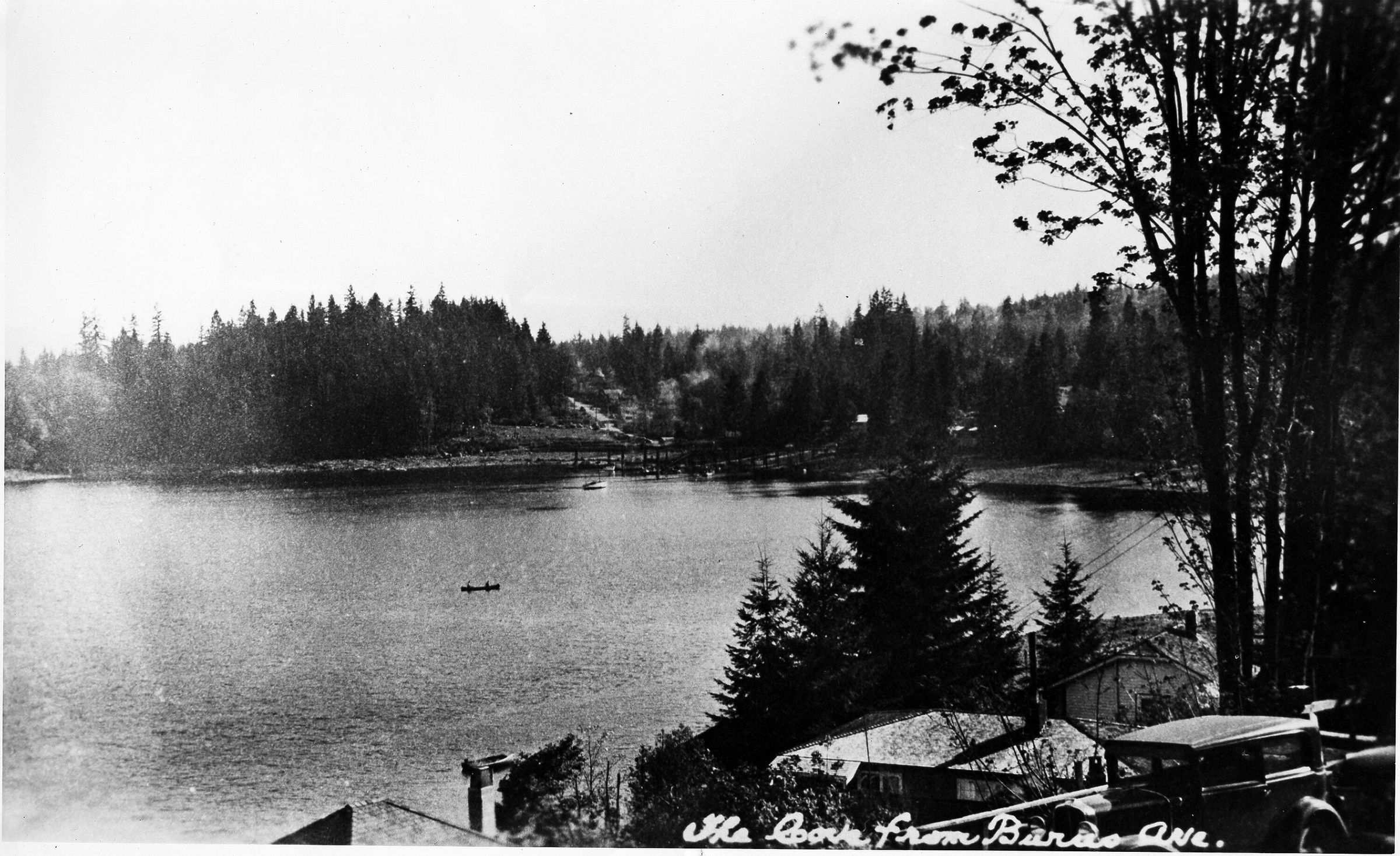 0023- The Cove from Burns Ave ( Panorama Drive) Black & White photograph looking out into cove, house