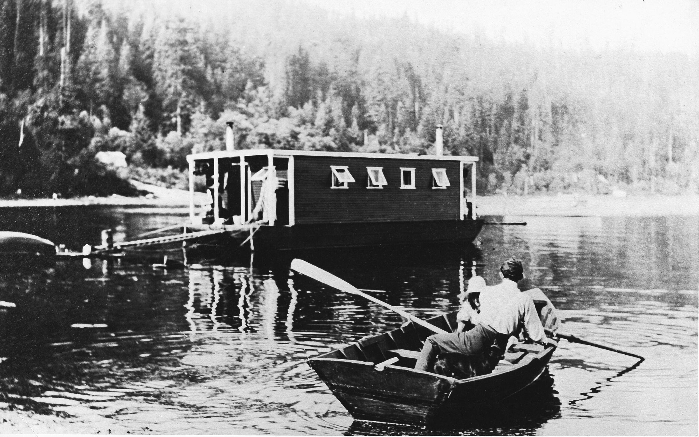 Foreground- couple in a rowboat, going towards a houseboat in middleground. Beach and forest in backgroundCollection