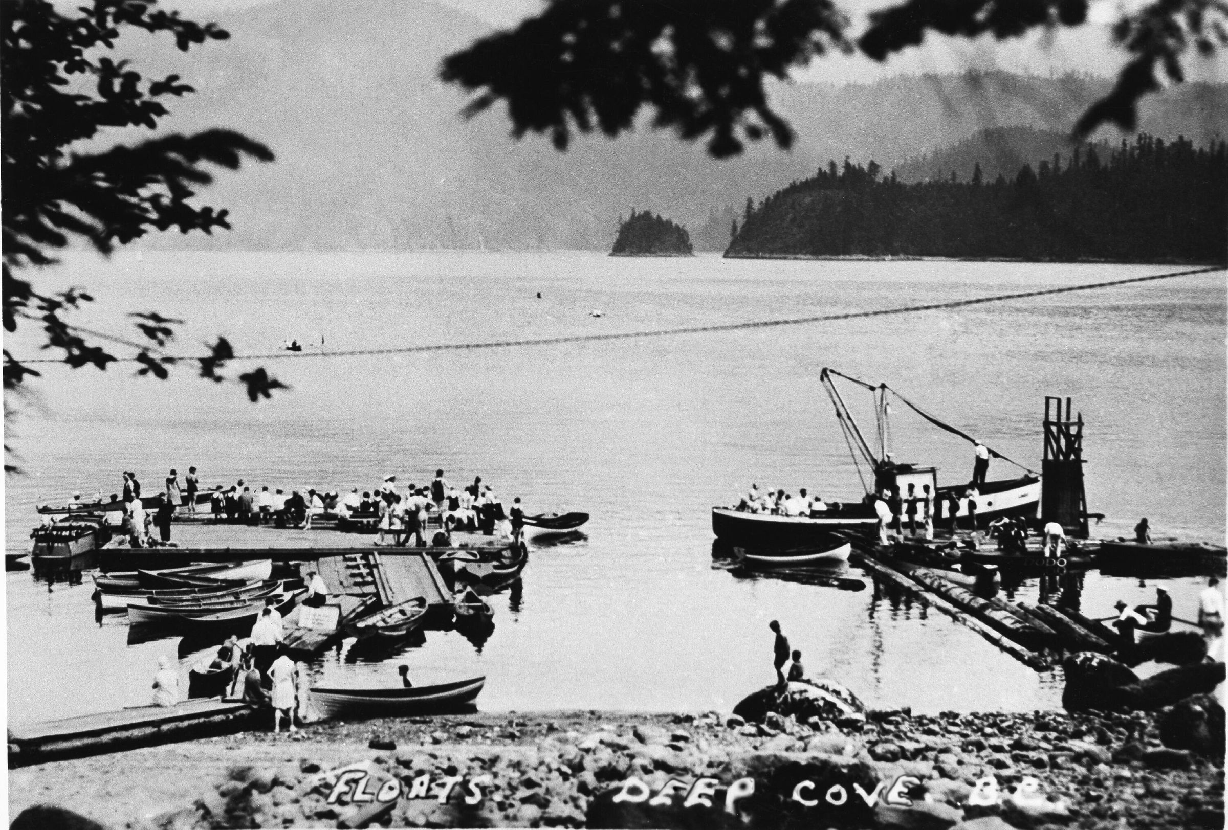 View of Deep Cove from a rocky beach. People on barge floats to leftside. Jug Island and Belcarra in background. Tree foliage in foreground