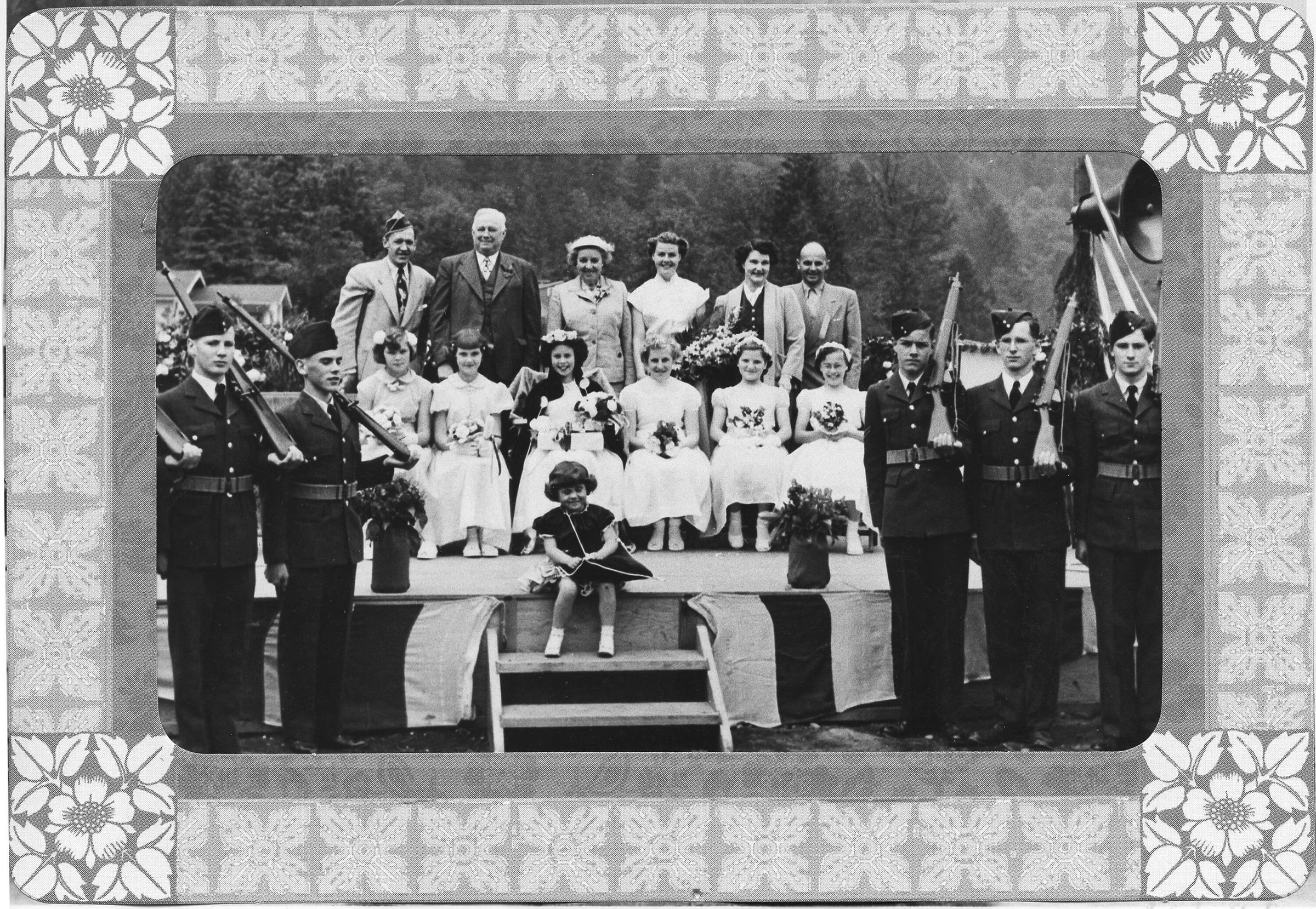 The ladies in the back row (4th from left) are Shirley Graves (who organized the majorettes and taught us how to do the May Pole Dance) and next to her (5th from left) is Mrs. Donald Elliott (Eileen). Don was a prominent member of the community. I think the man on the extreme left in the back row is “Babe Dowling” who only had one leg—he walked the entire PNE parade for the Lion’s Club using only his crutches. We thought he was superman. I believe the large man was either a Mayor or a Reeve of the District of North Vancouver (standing with his wife).Collection