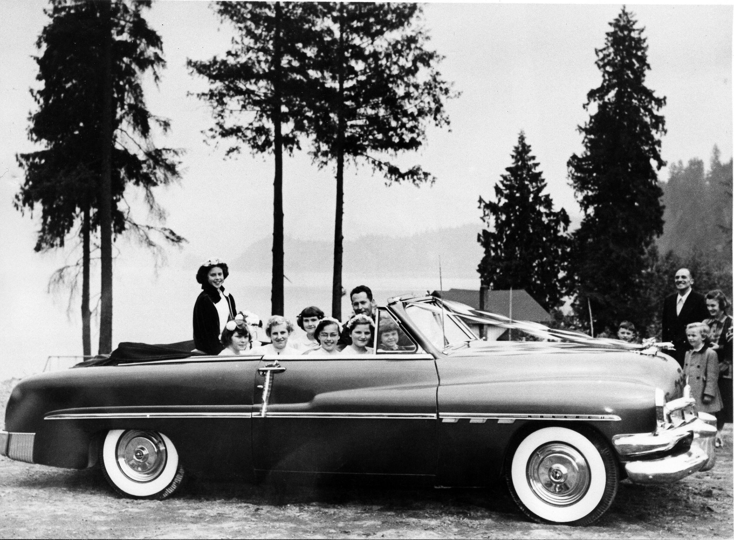 Black and White photo - group of people in convertiable car - dressed up - May Queen
