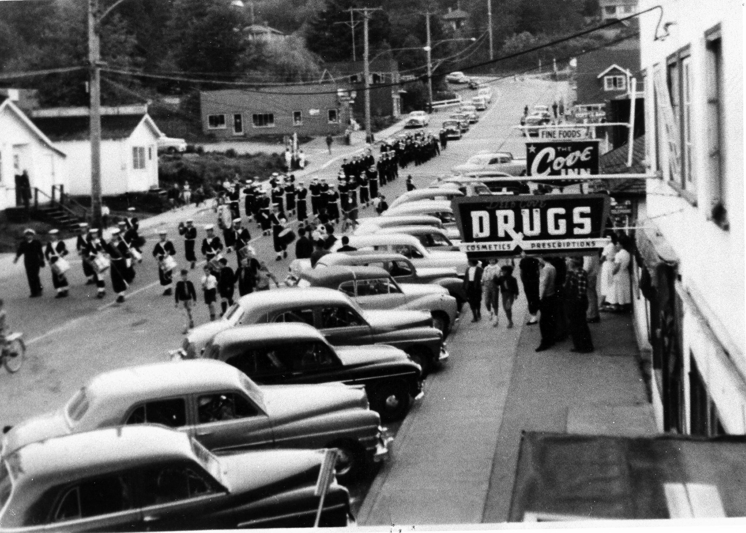 Black and White photo taken from left side of the street looking away from Deep Cove. Cars parked along left side. Parade going on. Cadets - marching band leading consession towards Deep Cove. People gathered around side walk to watch
