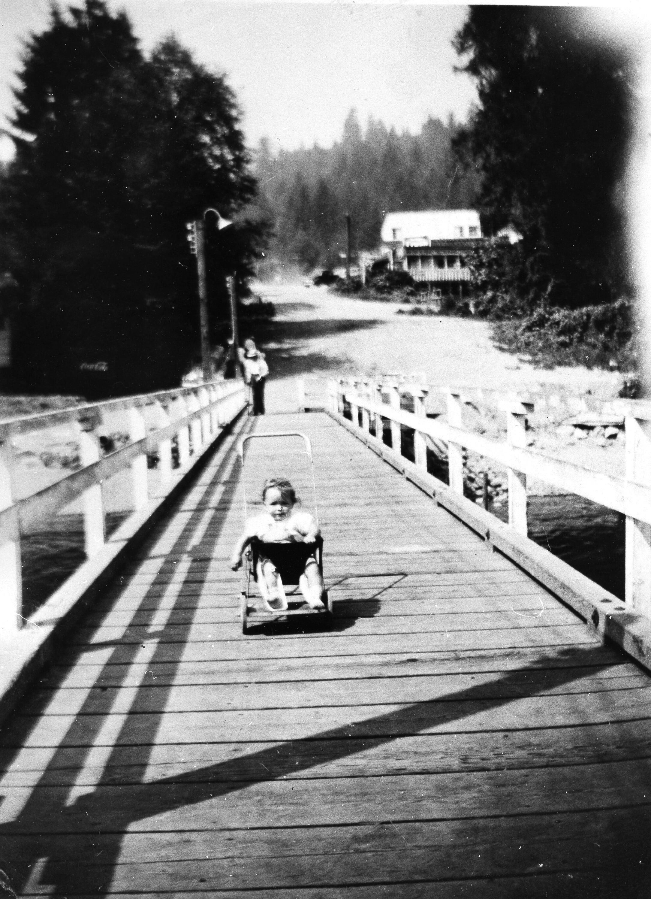 Black and white image, looking back at the Nutshell and onto wharf. Center of dock there is a child in stroller.Collection