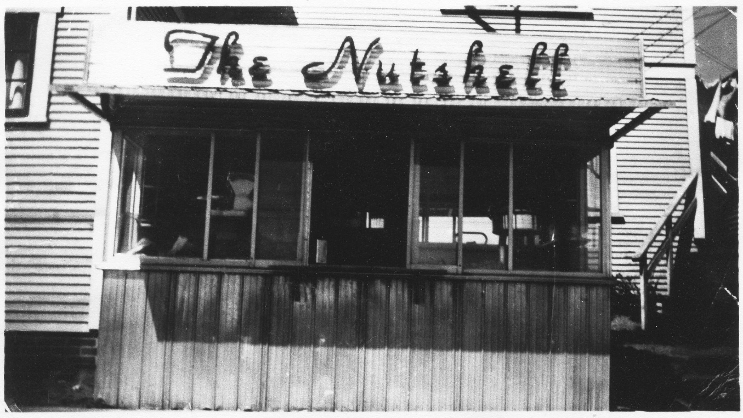 Black and white photo of cluse up of Nutshell store front and signage.Collection