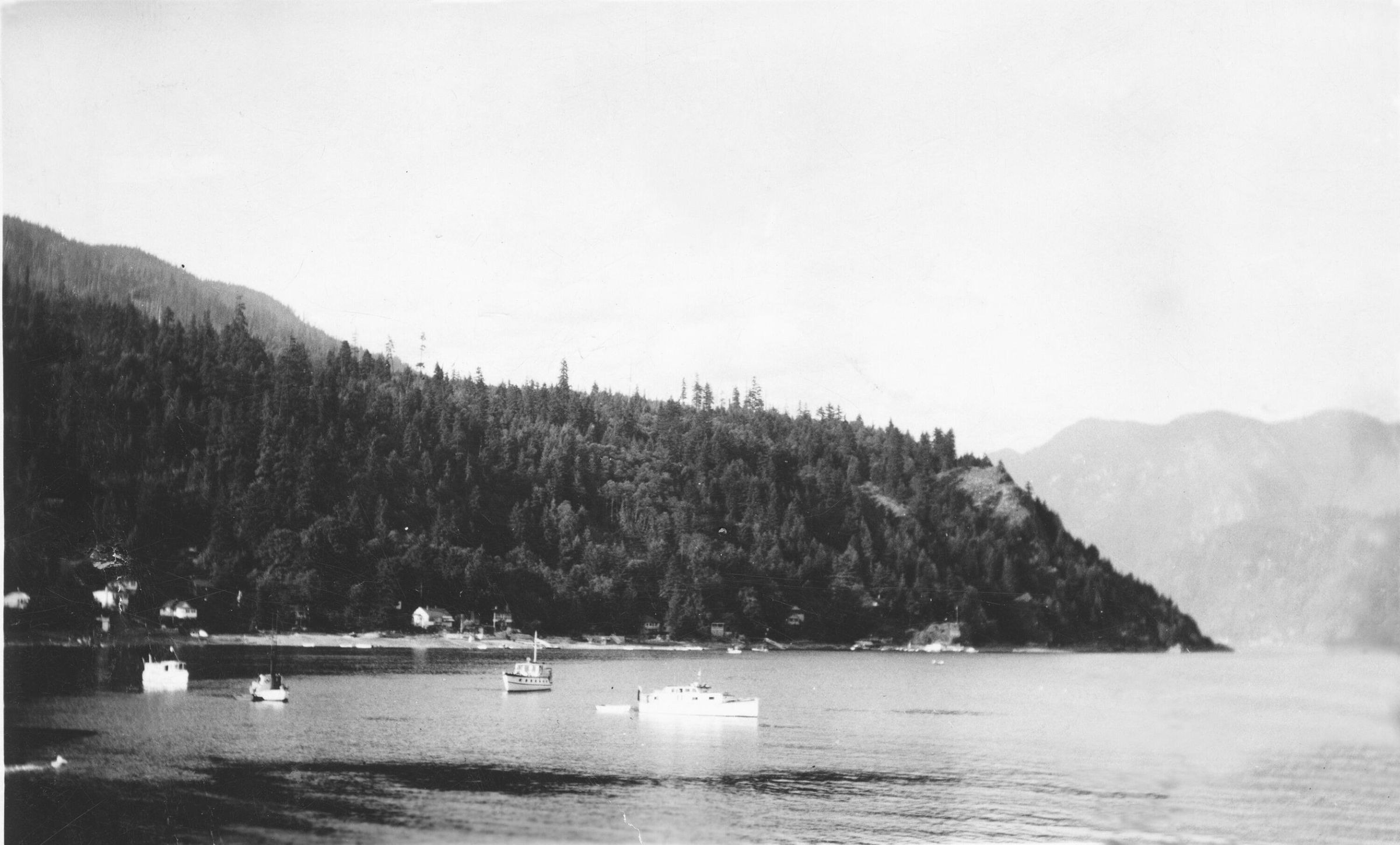 0057 - Deep Cove, North Shore Black and white image of deep cove with boats in the water.