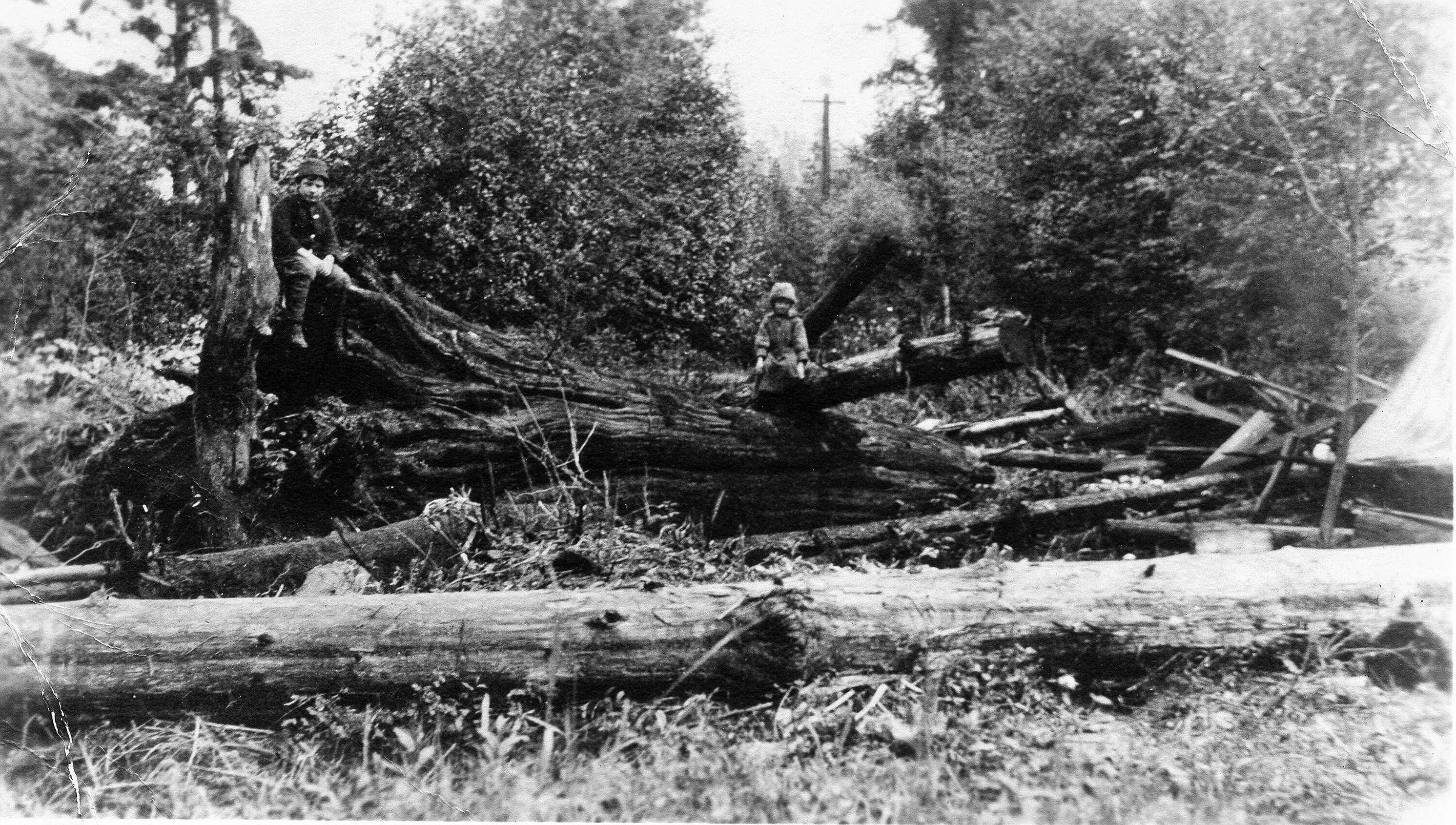 John Jr 8-1/2 yrs, Florence 7 yrs, Second Ave 1919. Shows stump & tree used to make lumber for shack.
