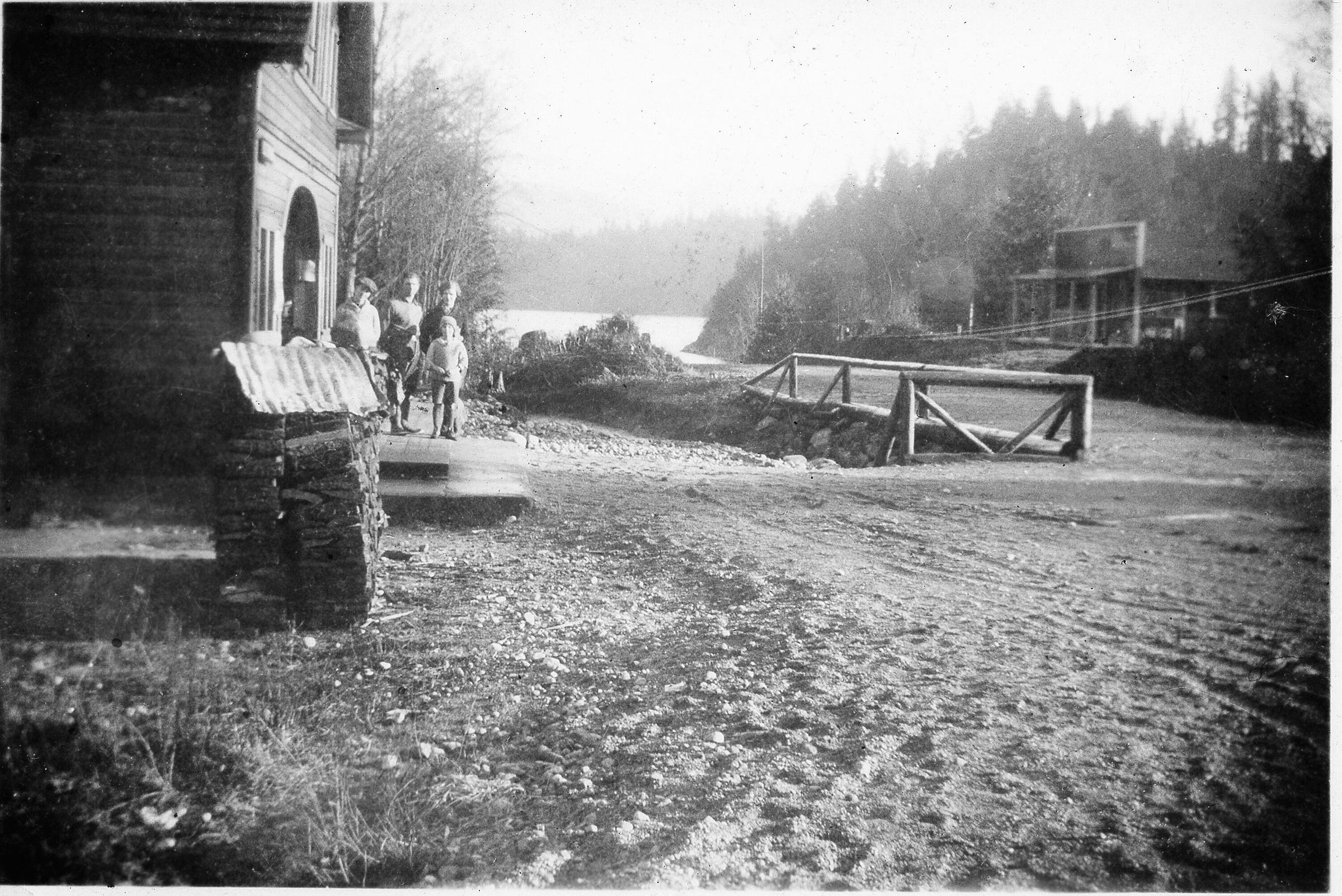 Moore House and family looking towards camera with Deep Cove in backgorund. House is to the right, street, Gallant Ave (Second Street) is to the left.Collection